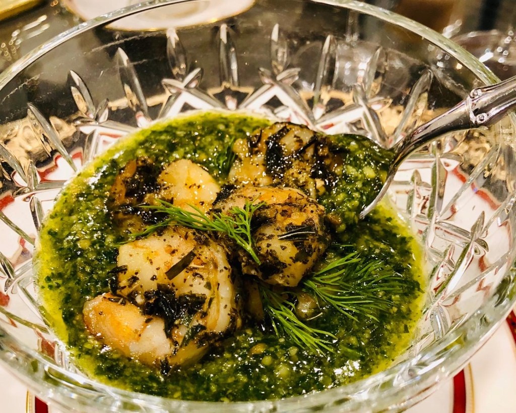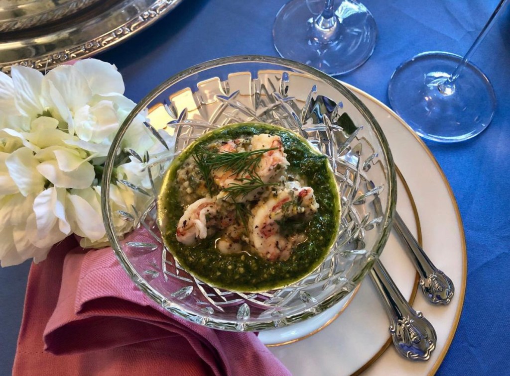 garlic and tarragon shrimp over homemade cheese-free pesto