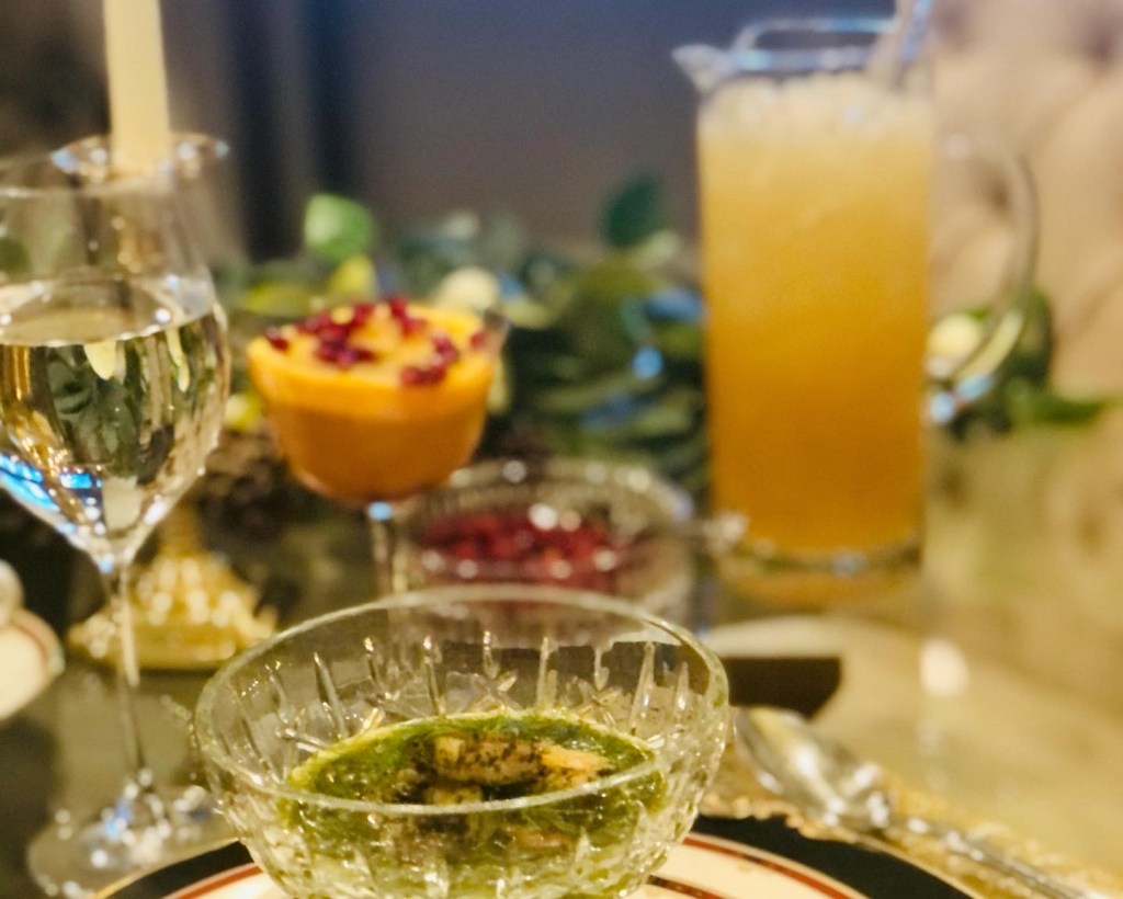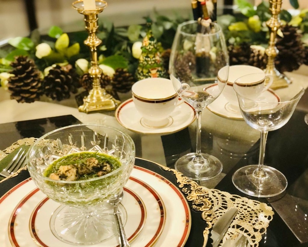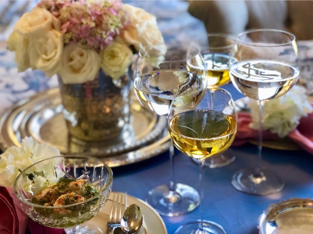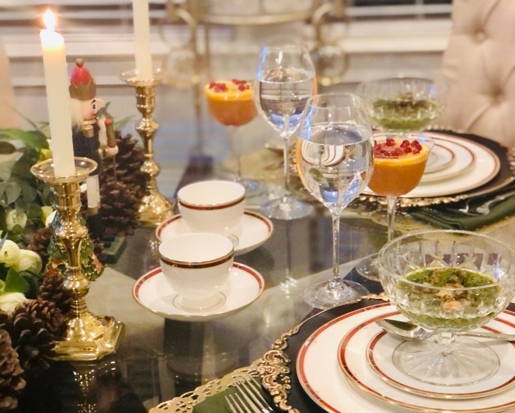 Crystal bowls from Waterford. Wine glasses from Crate and Barrel. Bone china plates from Lennox. Silverware is Napoleon Bee. Napkins from Wayfair.