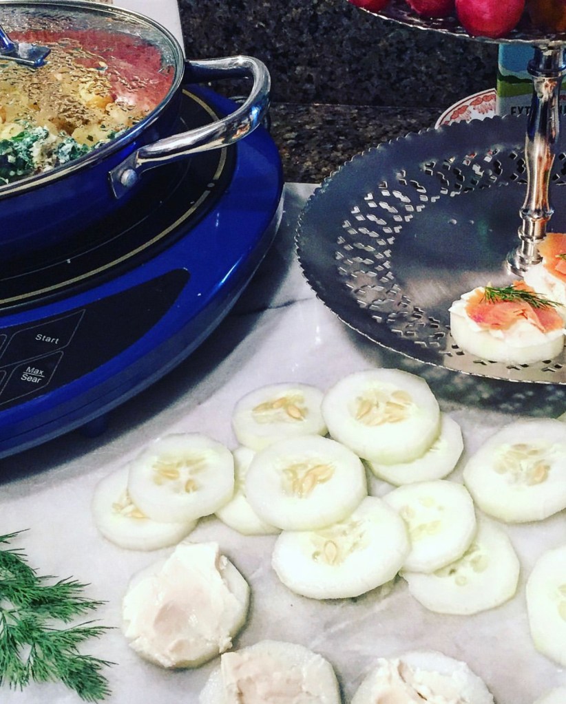 When prepping your brunch with smoked salmon, you want to leave your salmon in the package as long as you can. Smoked salmon isn’t dry, it is common to have a meely type feel to your fingers after working with it. So, try to leave it for the end or, take it out and do everything you need to with it, set it aside, wash your hands and then touch everything else. When you do take your salmon out, it will be in strips but connected to a carboard piece. You can pull it apart by hand or you can cut it with kitchen sheers. I do both. You will see in the photo small chuncks of salmon on each cucumber disc. One bite-sized mouthful. So, I set aside pieces of salmon, wash my hands and then wash the cucumbers.