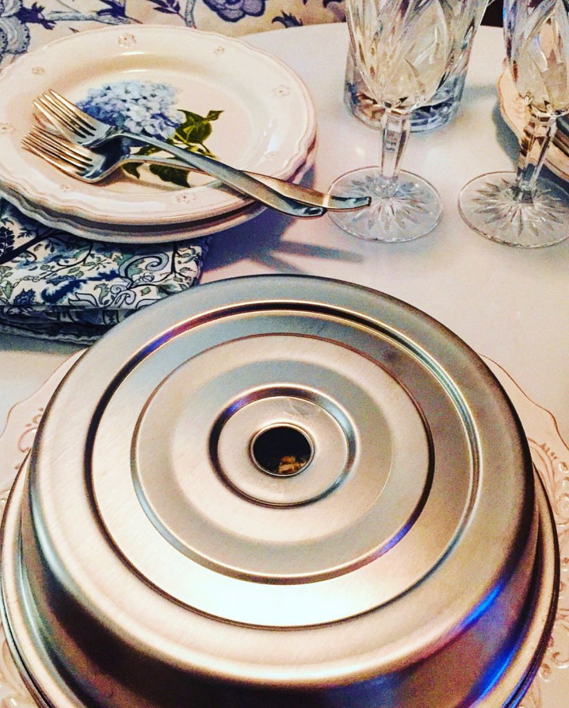 Below you will find the table setting for this meal. Plates and napkins from Pier 1. Metal cloche from Amazon. Crystal from Waterford. Two tier silver server from Wayfair.