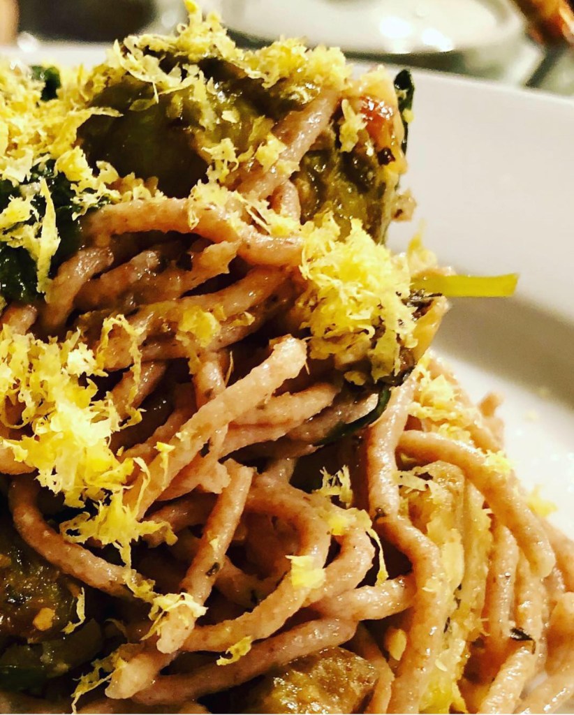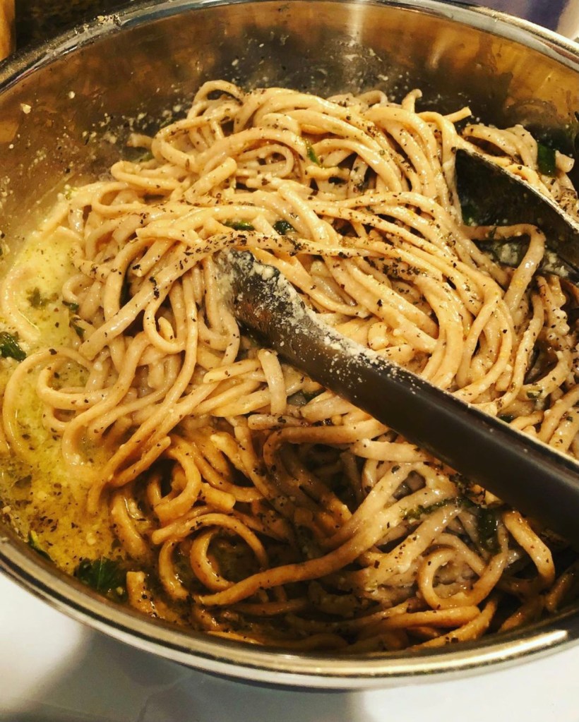 Start your water to boil in a pot, remember to season liberally with salt. When it boils, put in your noodles in, making sure to gently separate them as you go. They will take just a minute or so longer than other fresh pasta you will make as you used whole wheat flour but, they will still only take about five minutes. You don’t want to overcook them, you want a bit of a bite (al dente) and you will finish them in the lemon sauce you’ve made.