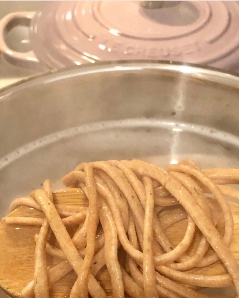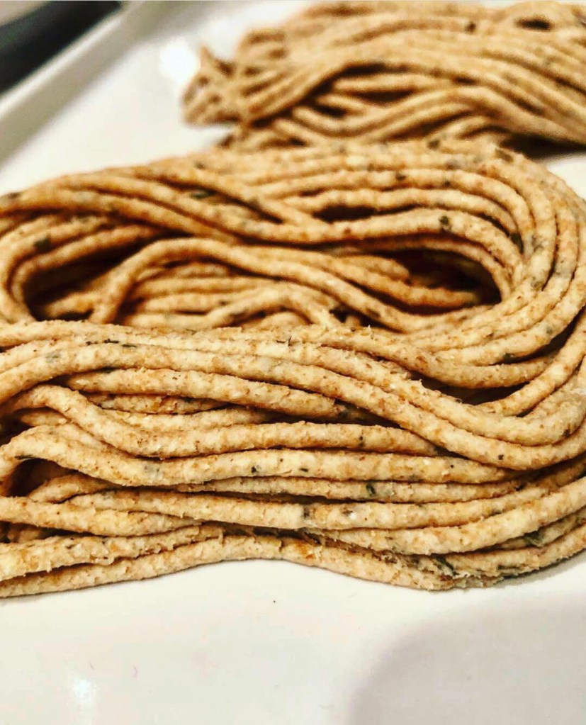 I try to only use our pasta machine(s) and not buy pre-packaged noodles. This gives me a lot of creative leeway and to control what goes in our pasta (if just to make me feel better about serving it). I love feeding different herbs directly into the noodles, it gives such an unexpected extra layer of flavor and the specks you see in each noodle shows your loved ones how much effort you really put into the meal.