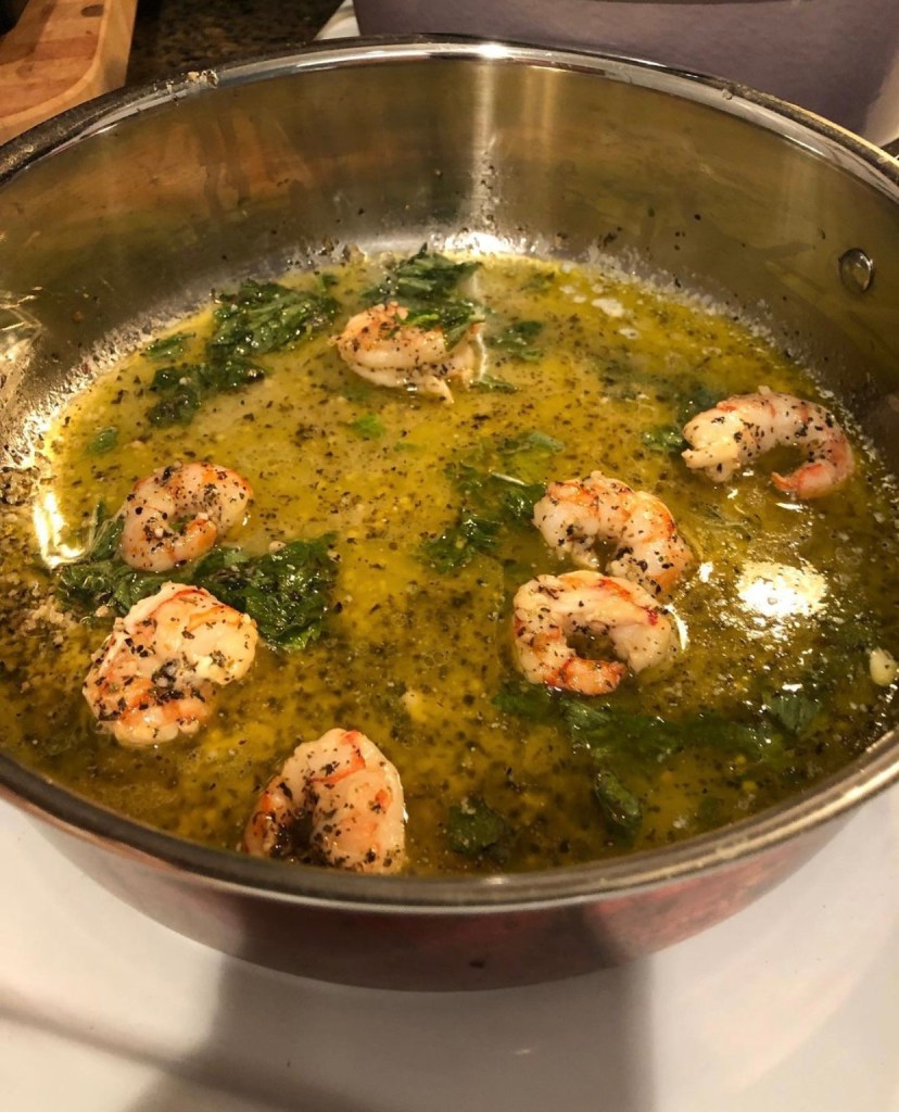 I always get shrimp frozen, I can use them later and they’re quite simple to defrost. You’ll want to put the amount you’ll be eating into a bowl and cover with lukewarm water. Leave out for just a little bit and they will start to defrost. I recommend the largest you can purchase as they shrink quite a bit while cooking. Get a sauté pan and coat the bottom with a bit of olive oil and minced garlic. I have mentioned before why I prefer minced garlic over fresh garlic in that I love that the garlic has been marinating in olive oil and is really easy to use. Feel free to mince your own at this time if you’re proficient and prefer that. Place the shrimp into the pan adding salt and pepper if you’d like, and some dried dill. Let it cook for a just a minute or two while adding your lemon juice from your two lemons and chopped fresh basil. Flip them over and season them again on the other side. When cooked, take them out and set them aside so they don’t over cook. You will reheat them later before plating by adding them to the top of the finished pasta in the pan.