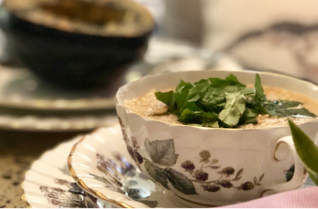 The soup is a simple serving with just the creamy golden soup, a drizzle of sesame oil and some cheese and basil. You can omit the fresh basil on the soup if you’d like, taste it separately before serving and see if you like it. The finishing oil of the sesame really brings out the nutty flavors of the roasted squash and cashews.