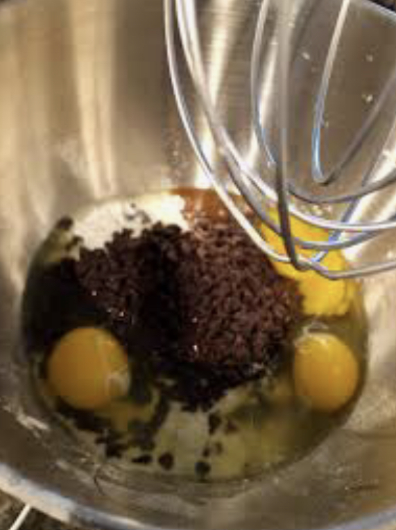 In a mixing bowl, add your flour ( 1 1/2 – 2 cups – depending on how many cookies you would like), three eggs (it’s been said that the more eggs you add the softer the cookies will be, so you can alter this to your liking), a splash or so of milk, half your bag of miniature chocolate chips (though my husband would have preferred more, I’m sure) two splashes of vanilla extract and butter (we had stick butter in our fridge and I used three tablespoons microwaving first to soften).