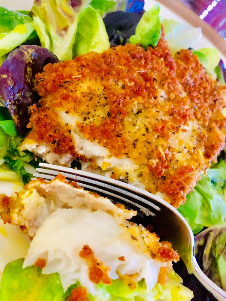 Fried food isn’t usually my thing. I probably should admit this up front. When I do fry things they don’t then ordinarily go over a salad. Today I felt like I needed a change; something about the start of a new week does that to me. I wanted to try to lighten things up and a crunchy seasoned panko crusted fish over some baby lettuce with a homemade tangy dressing sounded like the perfect combination.