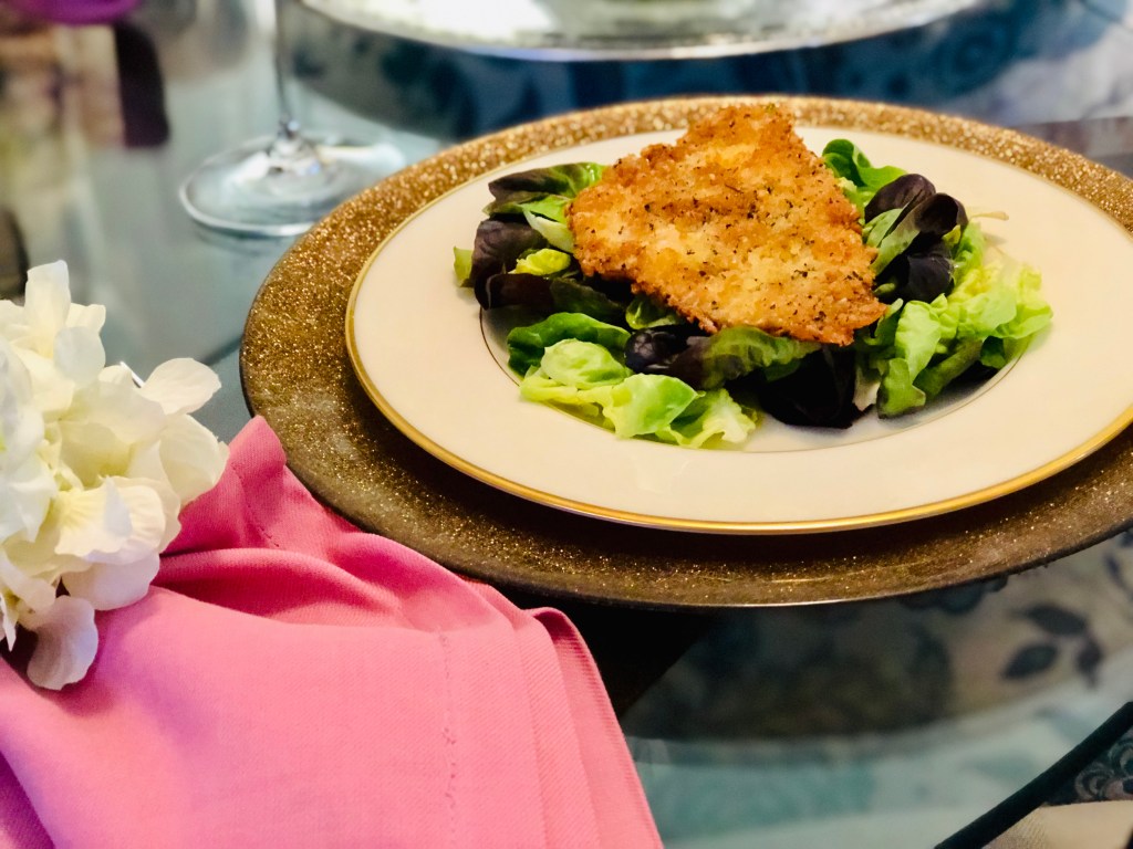 Table setting for this dish: Gold chargers and napkin rings from Pier 1. Napkins from Wayfair. Bone china plates are from Lennox.