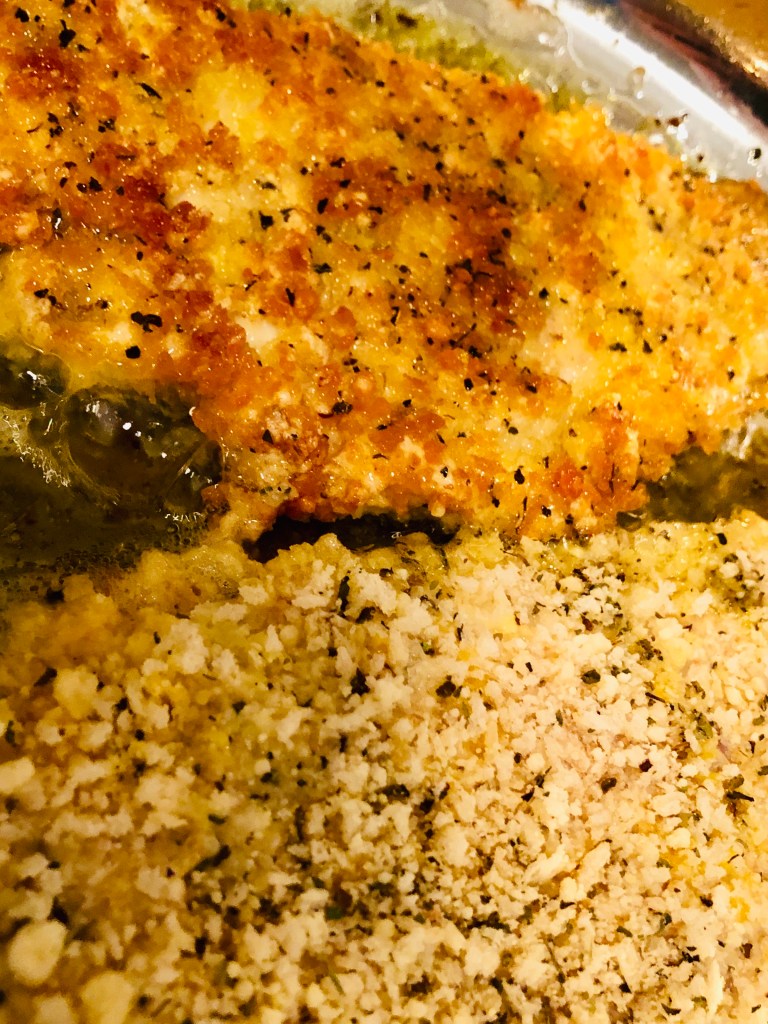 Move the fish down the dredging line with your hand – allowing the egg mixture to slop onto the fish as it will naturally, and then lay it gently into the panko mixture. With your other dry hand, pick up some of the panko and drop it onto the fish, coating it as you turn it upside down and do the same with the other side. Get every inch of your fish that you can. Now, heat your pan. I used medium heat, you may need medium high.