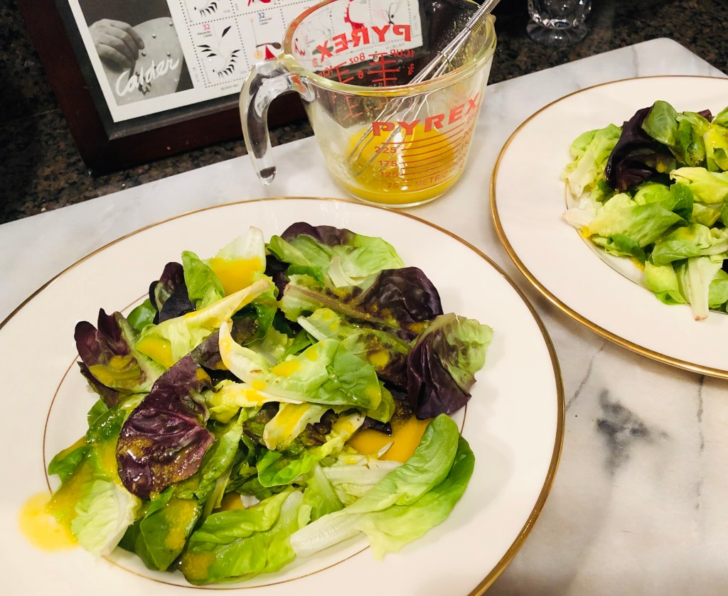 While the fish cooks, start making your dressing. I use a measuring cup as I can mix and pour from the same vessel. Growing up, we made a lot of our own dressings so, this is really a nostalgic and preferable thing for me to do. Take your mustard and squeeze in a half or better part of one tablespoon (depending on how much you like mustard) and a tablespoon and a half of lemon juice. Then, salt and black pepper (eye ball – I taste afterwards to see if I need more) and then get a small whisk or fork and hold it in your dominant hand. Start whisking the mixture while adding your olive oil. Whisking while adding it helps emulsify it. I use a liberal amount. Again, it depends on how many people you are feeding and please don’t be afraid to taste as you go. On a plate, put your lettuce and then drizzle over the dressing.