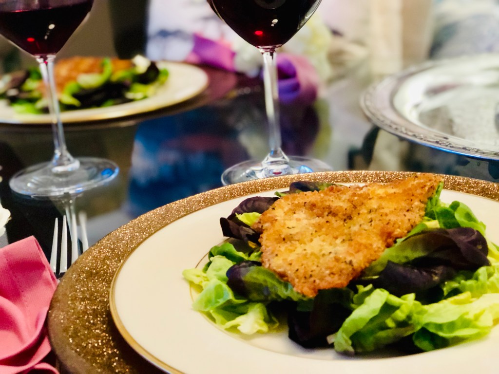 You do not want to soak the lettuce, you just want to coat it and make sure there’s sufficient flavor. You will pick up some vinaigrette with the fish as you eat this meal and it works perfectly with the seasoned panko. Place a filet on top of the salads and clean off the plate from any dressing or oil drippings from the fish as you plated it.