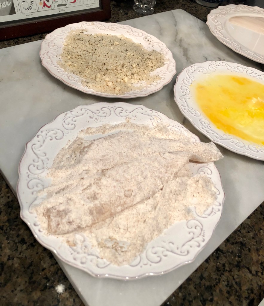 When I figured the fish was ready, in my pjs I rushed to the kitchen, grabbing three plates and went to prep my dredging station. I promptly made a huge mess; spilling the flour all over the floor, dropping an egg and not realizing the juices from the defrosted fish were still on the plate when I removed it from the fridge.