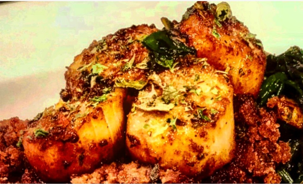 This whole meal took only about twenty minutes (potatoes enjoying the largest amount of that time) and would be fantastic for a wet day like today. The crumble provides the balance of sweetness with the savory scallops. The spinach has the perfect mouthfeel with the potatoes. Complete everything with a soft Riesling or an Amaretto Sour, and some music… Life almost at the beach.
