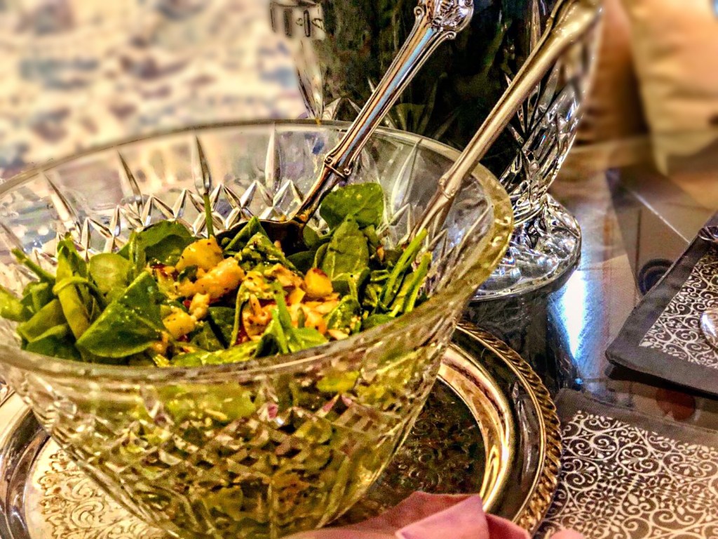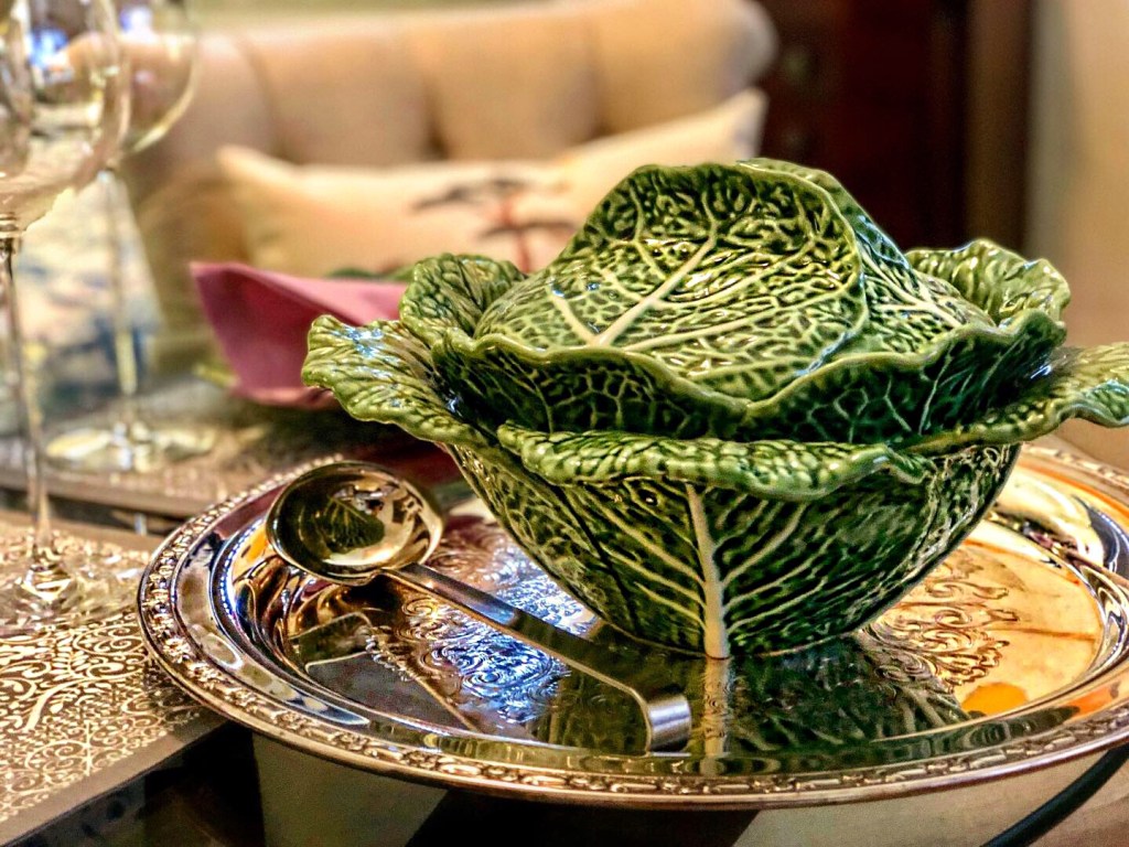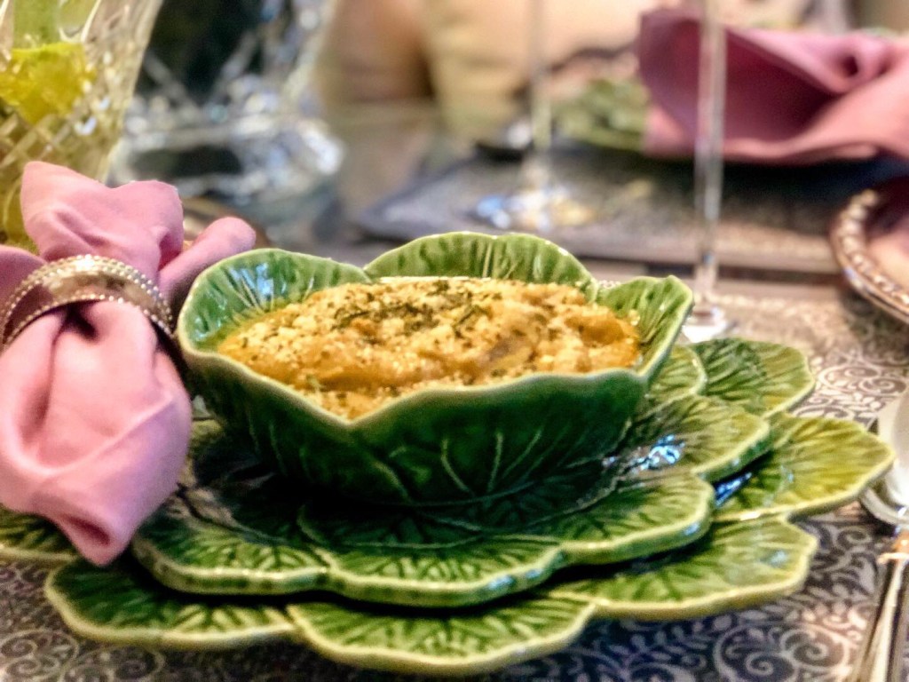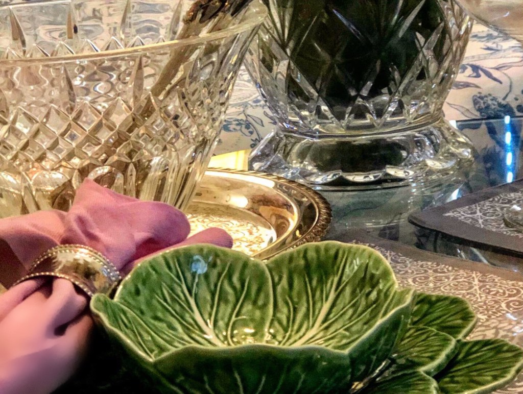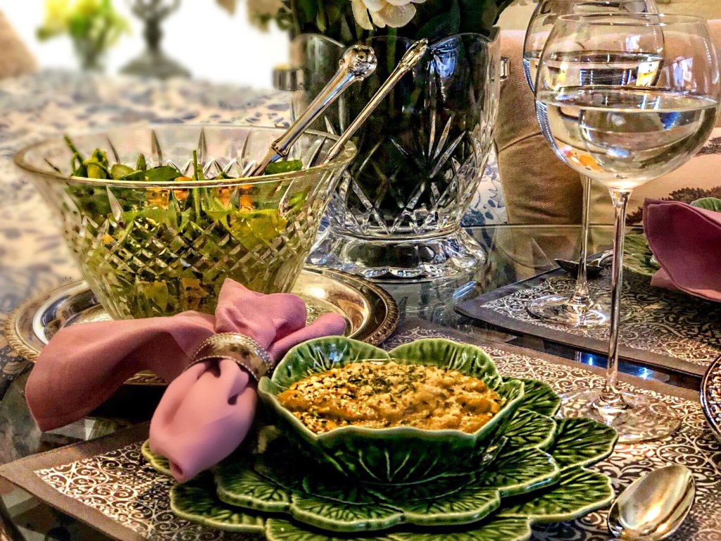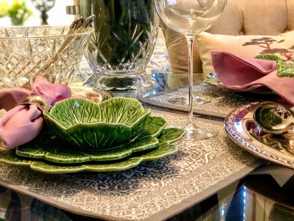 Below you will find the table setting for this meal: Lettuce dishes are from Replacements. Silverware is Napoleon Bee. Crystal is Waterford. Glasses are Crate and Barrel. Napkins, Placemats and Napkin Rings are from Pier 1. Lavender pot is Le Creuset.
