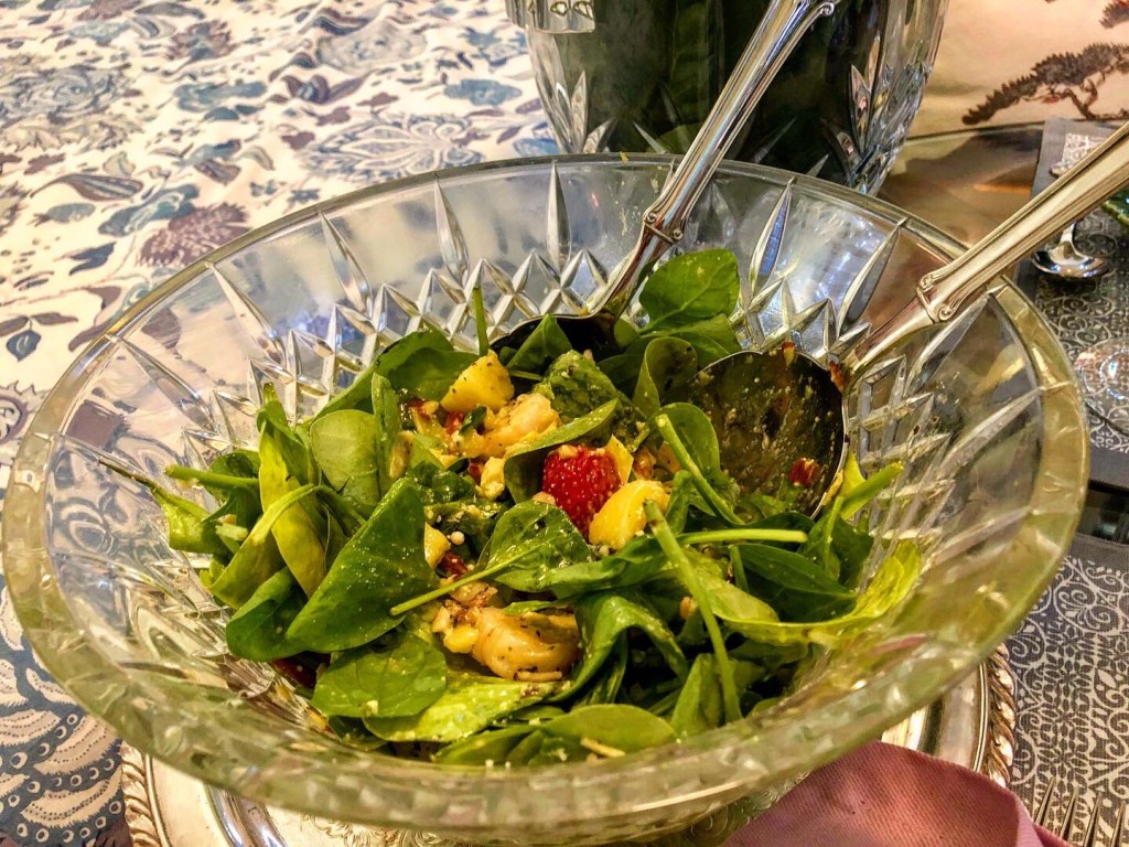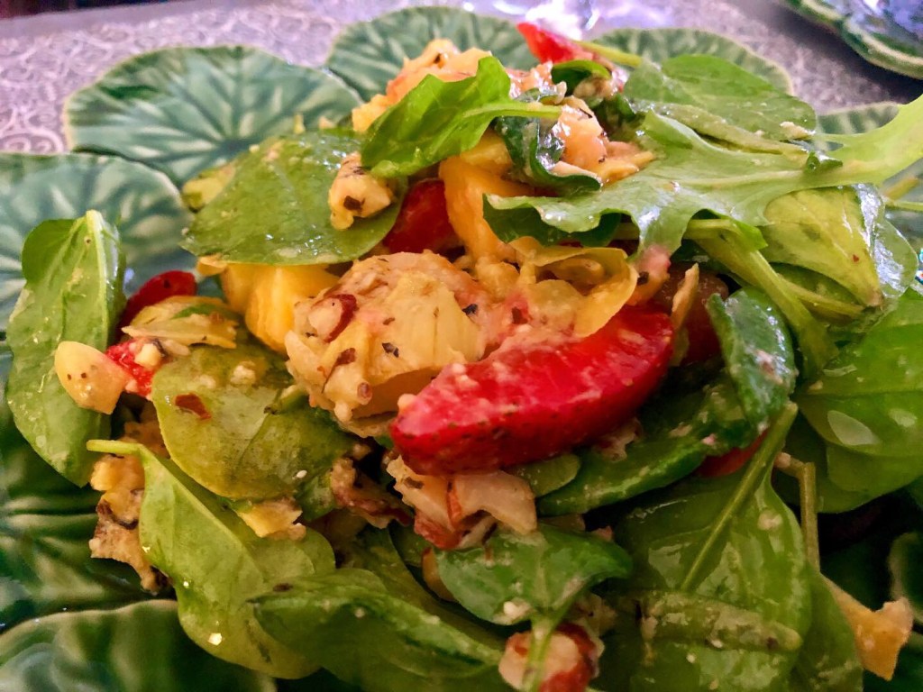 Get your serving dish ready with lettuce, rinsed and sliced strawberries, grated parmesan and as many sliced almonds as you’d like. Take a slotted spoon and drain your shrimp, artichoke hearts and polenta placing everything delicately over the lettuce.