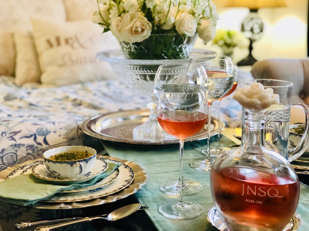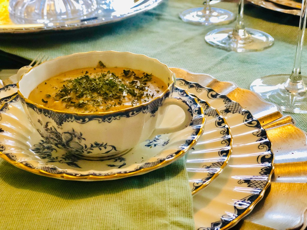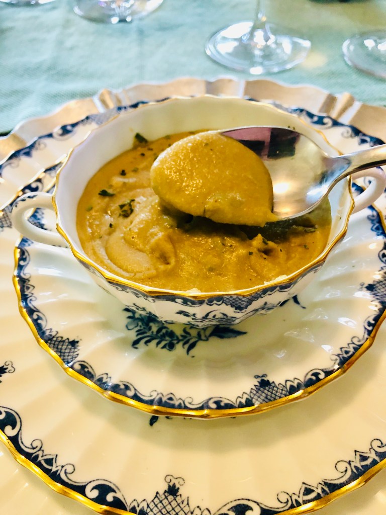 Below you will find the table setting for this meal. Bone china from Worchester. Silverware is Napoleon Bee. Napkins, chargers and table runner are from Pier 1. Crystal is Waterford. Wine glasses are from Crate and Barrel. Soup maker is Phillips. Copper sauté pan is from Cuisinart.