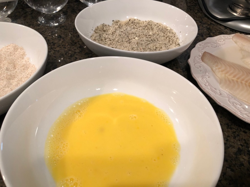 First, with a designated “dry hand” (I use my right), place the fish into the flour. Then, take that same hand and flip it over. Using your fingers to lift the flour, make sure the fish is coated completely. Take your hand and lift the fish and place it into your eggs. Taking your other hand, now your “wet hand”, lift the fish and flip over making sure both sides have egg. Take your wet hand and lift the fish placing it into the panko mixture, taking your dry hand again now, and make sure both sides are coated. Do all the fish you plan to eat, leaving each one resting on a plate until done.