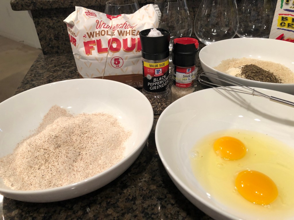 Make a dredging station using three large bowls or plates. Starting on the left with your whole wheat flour, then your two eggs and finishing with the panko. Over the panko, put two tablespoons of grated parmesan and dried basil, each. Salt and pepper the flour and the panko.