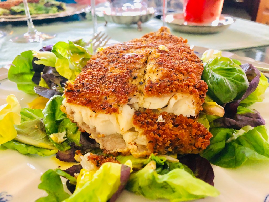 We get our fish frozen from Target. The bags of flounder are very reasonably priced and individually packed. I rip open two, and they defrost very quickly. Flounder is a buttery fish that is very low in calories (around 80) and have about 14 grams of protein. They can be turned into fish tacos, fish stew and soon to come, with brunch (I will post in the future) as some examples. In this case, I breaded them and placed over soft lettuce with my mustard lemon viniagrette.