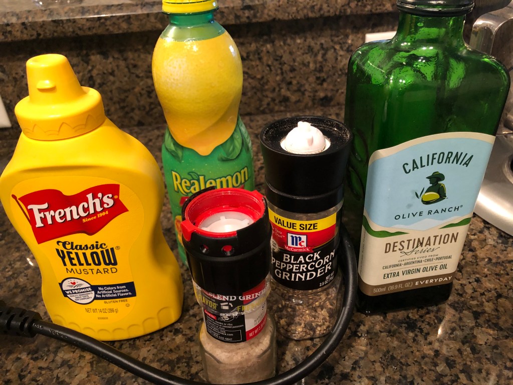 In any container you like, put at least one tablespoon of yellow mustard, one tablespoon of lemon juice, salt and pepper to taste and then in one hand hold a whisk or fork, and in the other the oil. Start to pour the oil in while whisking the mixture so it emulsifies. Add as much oil as you like, usually doubling the liquid already in the container (meaning: if you use a measuring cup to combine everything, eyeball the height of the dressing without the oil, and add enough oil so that the line doubles in size).
