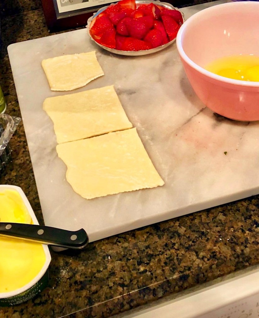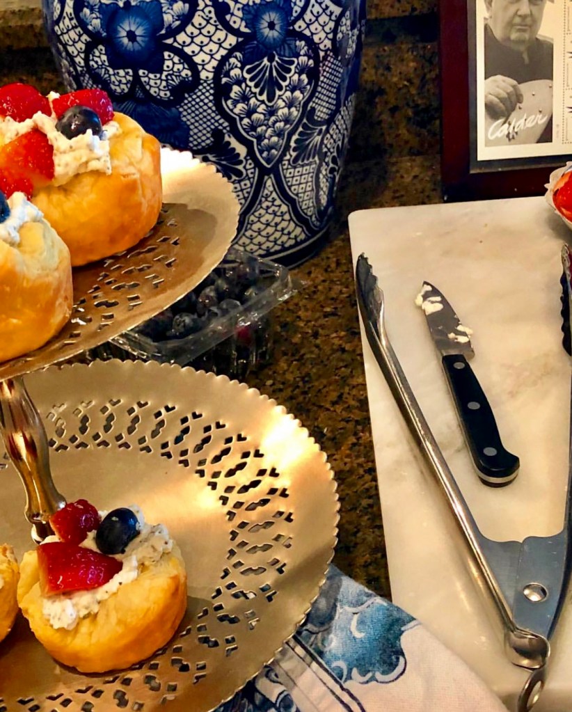 After you place each square in your muffin tin, stab over and over and over with little fork holes in the bottom of each pastry so that it doesn’t puff up too much in the oven. Mine did, and it’s okay if your pastry does as well. This doesn’t have to be perfect. I put a bit of egg wash on each one to have them brown just a bit. Bake it according to the directions on the back of the box. Prep your berries in the meantime, removing the tops of the strawberries and slicing them into quarters or halves, for example. Once they’ve been removed, fill with your ricotta and basil goat cheese mixture and then top with the berries. Serve immediately if you’d like them to stay warm (unless you’re serving them covered, in which case they will stay warm for a while).