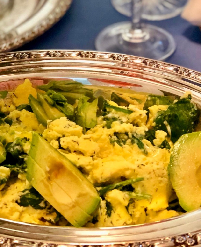 Avocado as you know, has a tendency to “turn” so, save the adding of the avocado for as late as you can. You can turn the stove on low to keep the eggs warm. I used a silver lidded vegetable dish so, I was able to plate and place something on top to keep the eggs from going cold.