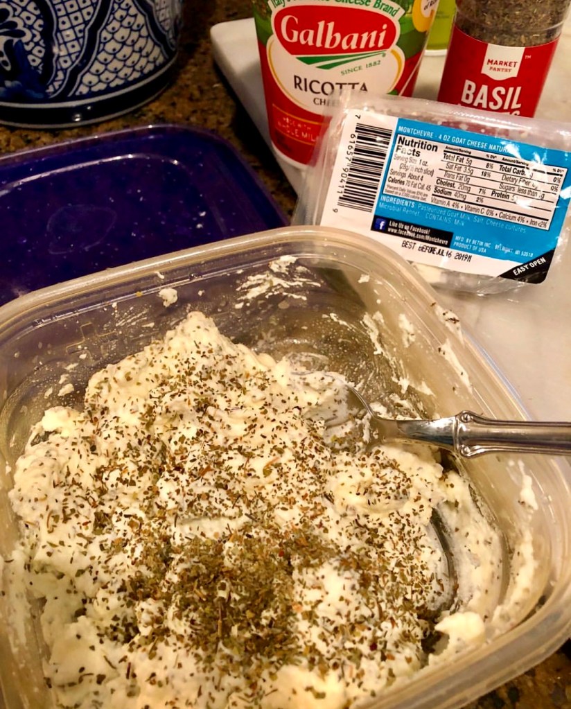 When you buy puff pastry, it will come with two separate sheets wrapped individually. I only needed to unwrap one and leave out to defrost. Place the other package back in the freezer. Meanwhile, get out a colander and rinse your fruit and then leave out to dry. You can sometimes find goat cheese with basil already mixed in. Otherwise, take out the cheese and place it in a bowl and mix in some dried basil. Stir with some ricotta. Taste it as you go until it’s to your liking.