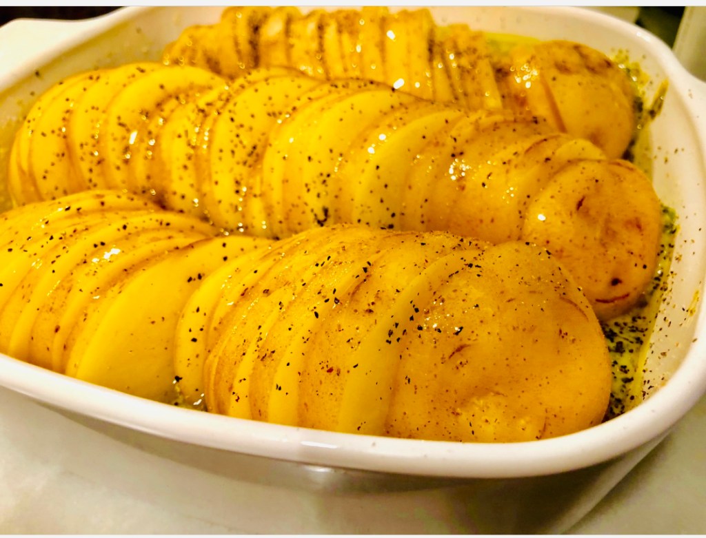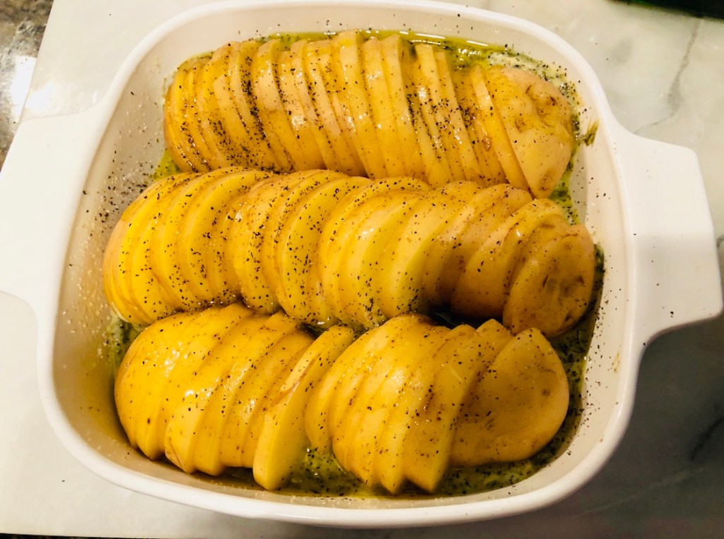Taste and make sure you like the pesto to mayo ratio. Take your potatoes and quickly rinse them but leave the nutrient dense skins on. Slice into disks that will fit in your dish sitting upright. You will need to know which dish you plan to use to do this, so you can pick up the correct amount of potatoes. If you’d rather portion this out as separate dishes, use ramekins. You can place a small amount of your pesto mayo in each one and a potato and cook the ramekins instead of the whole casserole.