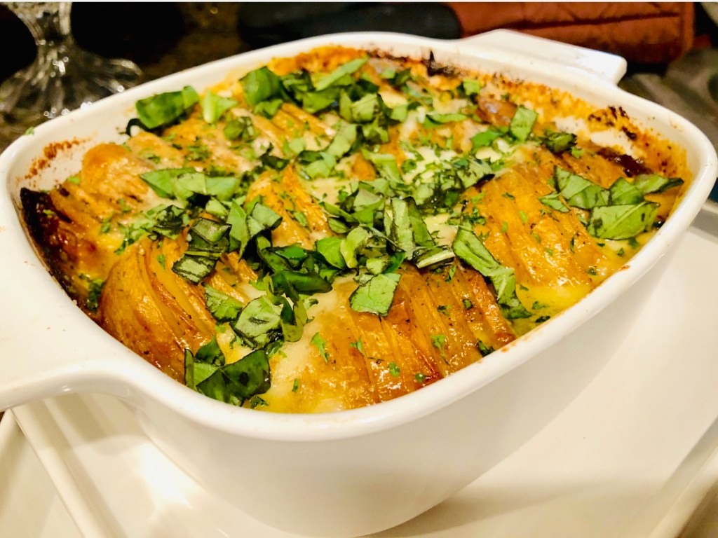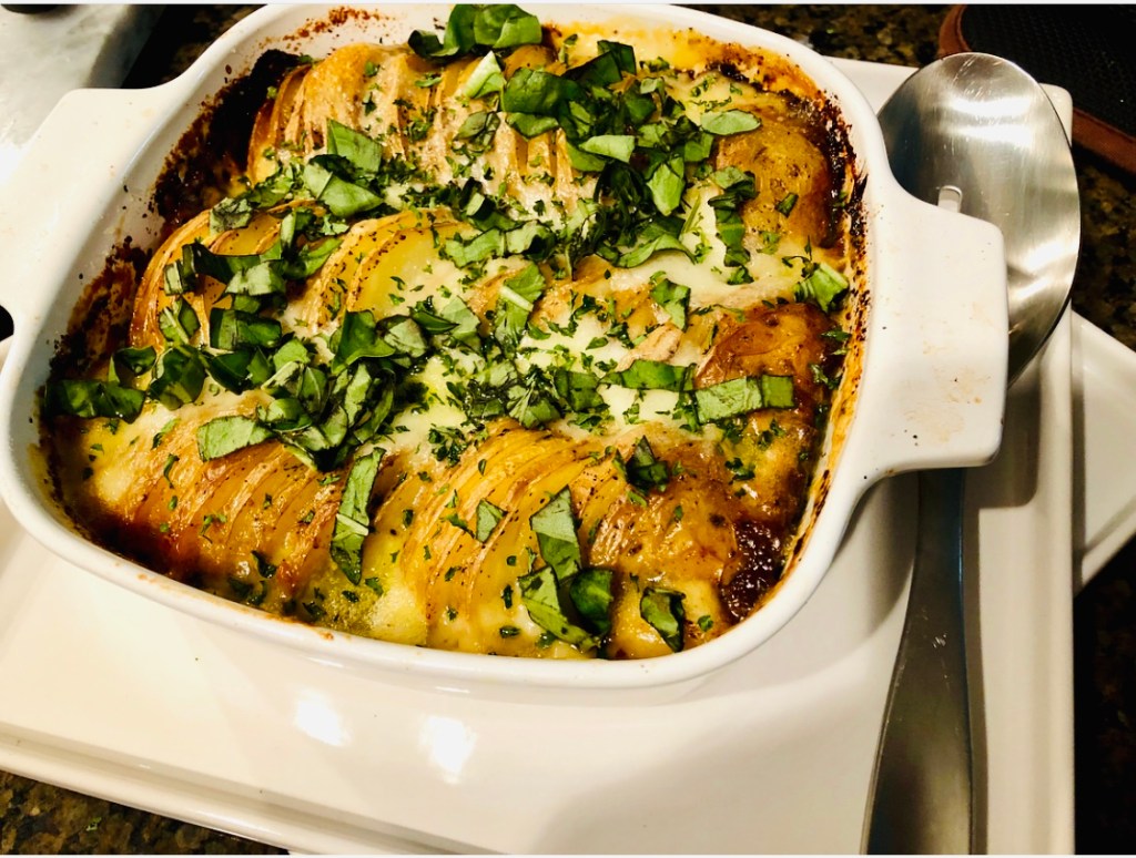 My cooking time / temp: 350 for 40 mins until I could pierce the potatoes and tell that they were soft. I then placed the fresh mozzarella on top, all over the potatoes. I placed it back into the oven and let it continue to cook until the mozzarella was melted. Again, if you don’t want it to be too brown, go ahead and cover gently with aluminum foil.