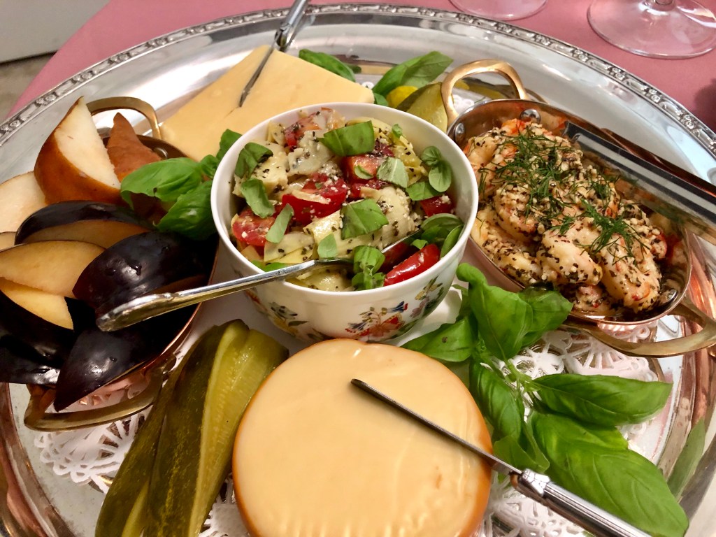 Artichoke hearts are quartered and marinated in olive oil, grated parmesan and dried basil. I added some sliced grape tomatoes for more color and texture. Flanking the tray with sliced dill pickles and fresh basil… Ending with some delicious fresh fruit, whatever looks good and is in season.