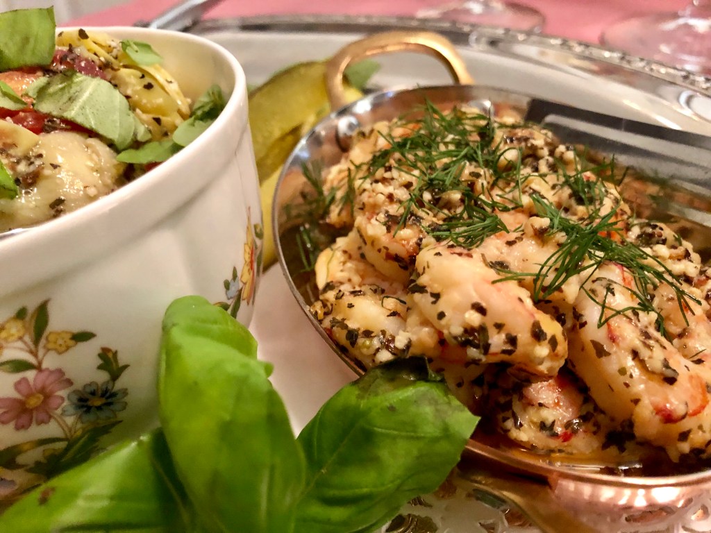 Heat your sauté pan with some olive oil and minced garlic (medium heat). Plop your shrimp in the pan, it’s okay if they’re not completely defrosted. Put the salt, pepper and dried basil on the top of each shrimp, leaving them to sauté for a bit. The pan will have quite a bit of liquid after a while, which is a good thing. They will steam as they cook keeping them plump and juicy.Now flip them and season the other side. Right before they are done, you will see them bright pink and the liquid in the pan mostly gone. At this point, top them with grated parmesan. Let the parm mix with the pan’s seasonings of garlic and basil… Scoop all of the shrimp with the seasonings from the pan into whatever vessel you plan to serve them in, and top them with chopped fresh dill.