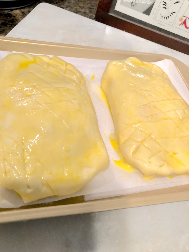 Place the wellingtons folded side down on parchment paper on a baking sheet, leaving some space in between them as they’ll puff up in the oven. Coat the tops of the wellingtons with more of the egg wash so they’ll get a gorgeous brown color and, if you want, make a criss cross design on the top, then pierce the tops of the wellingtons with a small knife three times to let some of the steam out while they cook.