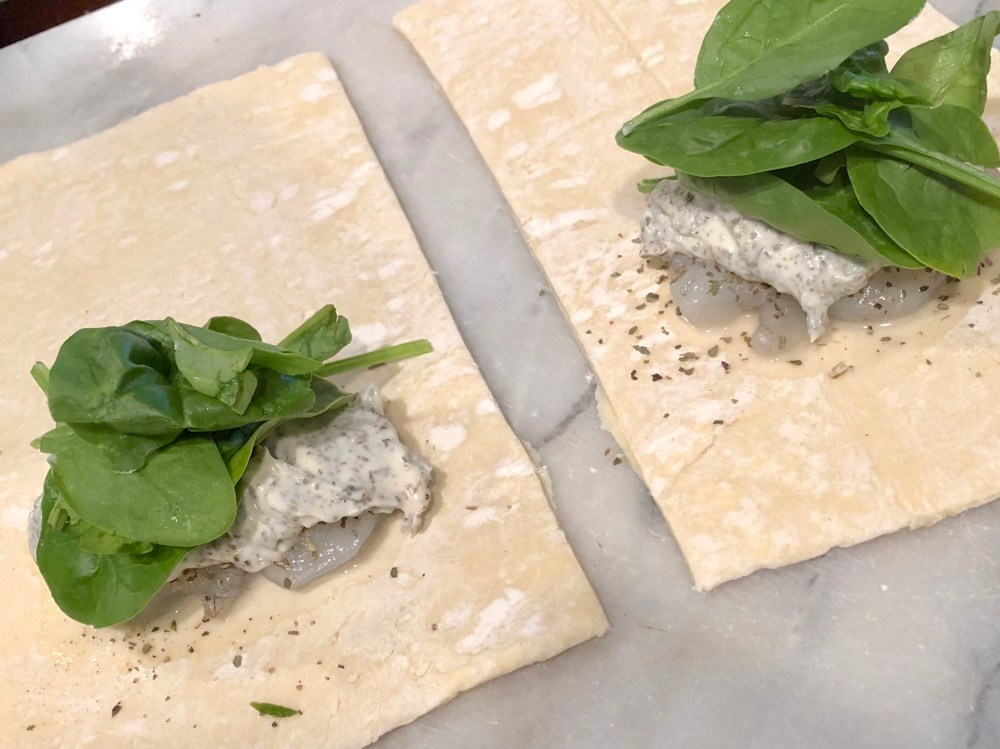 On top of your shrimp, place your clumps of tarragon mayo and then as much shrimp as you think you can fit with knowing the other part of the pastry sheet is going to be brought up and over the pile to close the wellingtons.