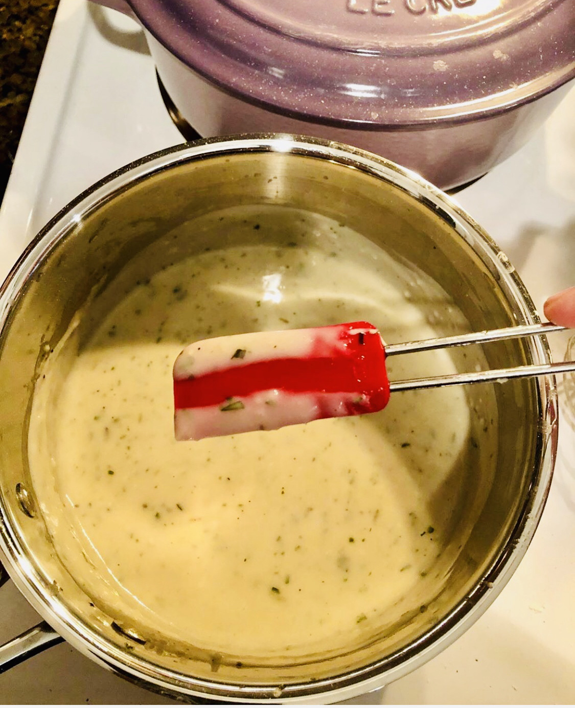 Bring it to boil. Then reduce. It will thicken. Add your salt, pepper and tarragon. Stir more and remove from the heat all together once it’s thickened and you can make a straight line down the middle of a spatula without it running, it’s done.