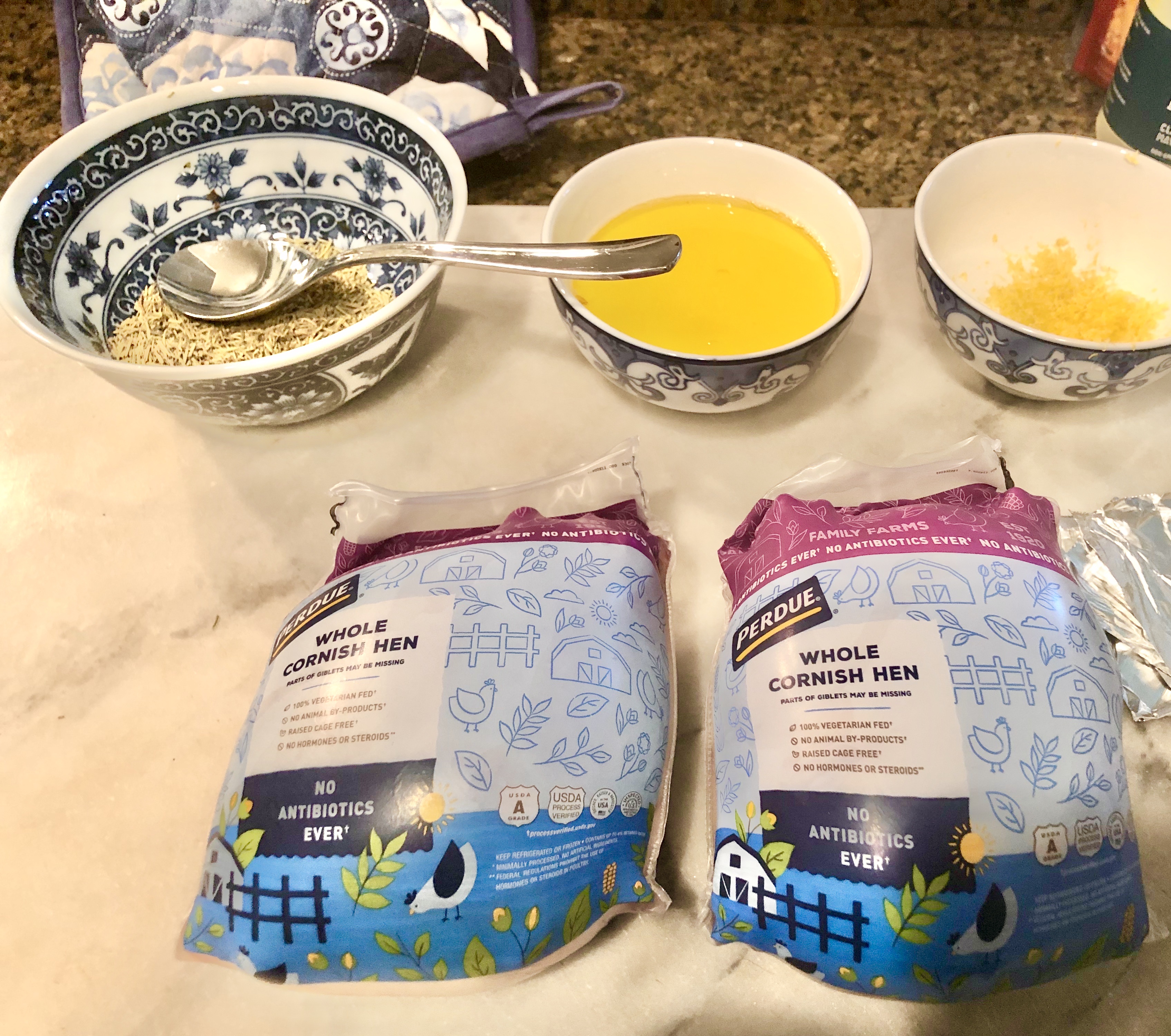 I have another recipe for Cornish Hens with soup and veggies, where I added additional citrus to the flavoring. For this, I just used lemon.
