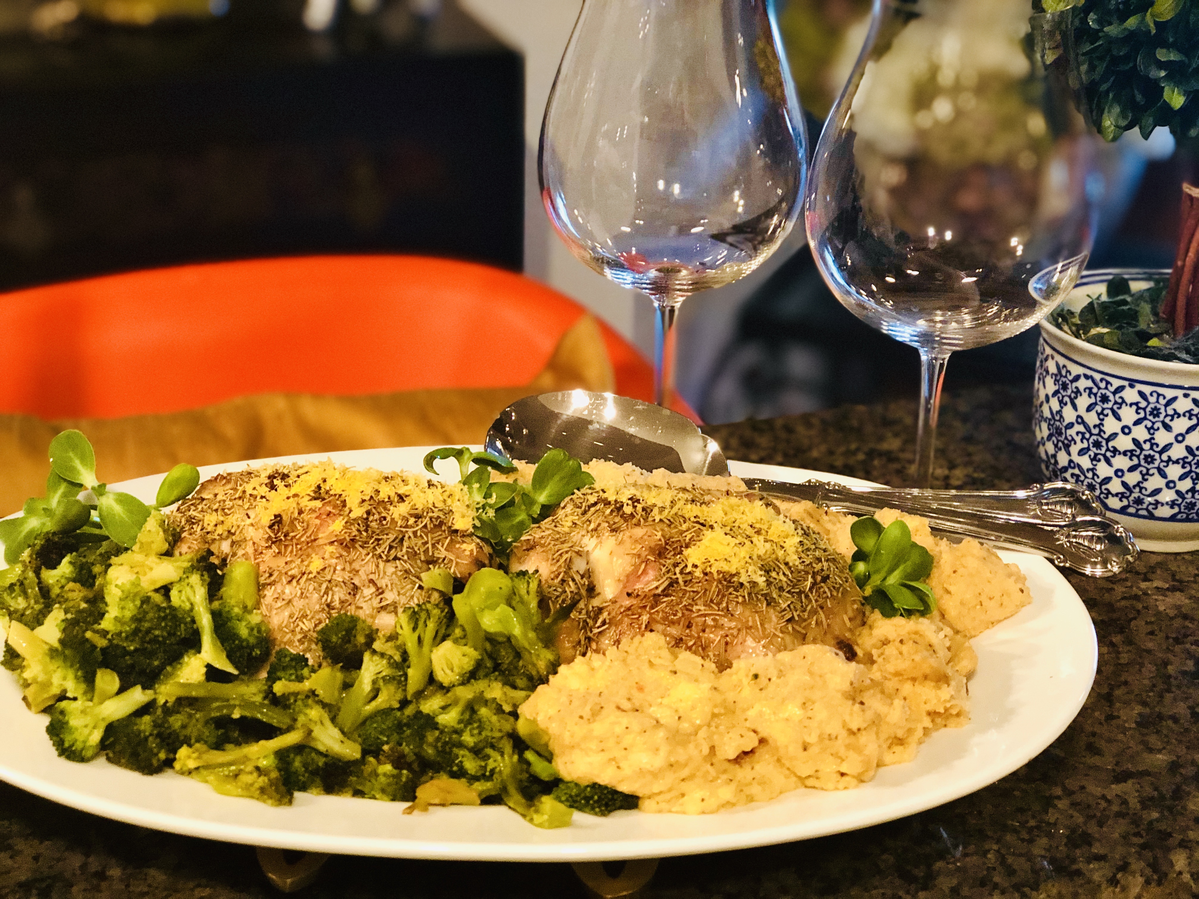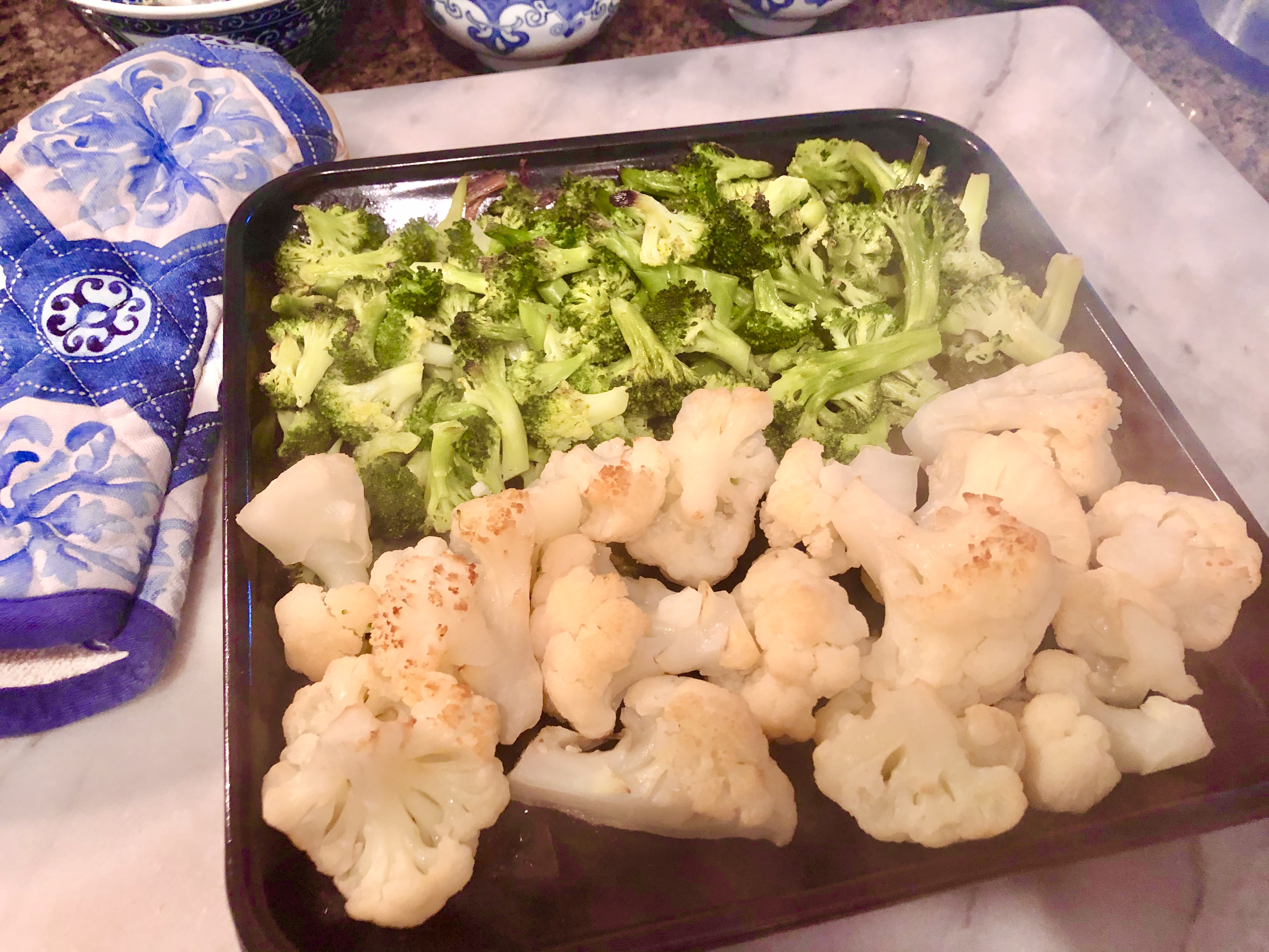 Little cornish hens are the perfect size for one person, need almost no prep and are virtually fool-proof. These came in a package of two for around six dollars. We love, love, love roasted broccoli florets in toasted sesame seed oil (trust me, it does make a difference) and roasted cauliflower faux “mashed potatoes”.