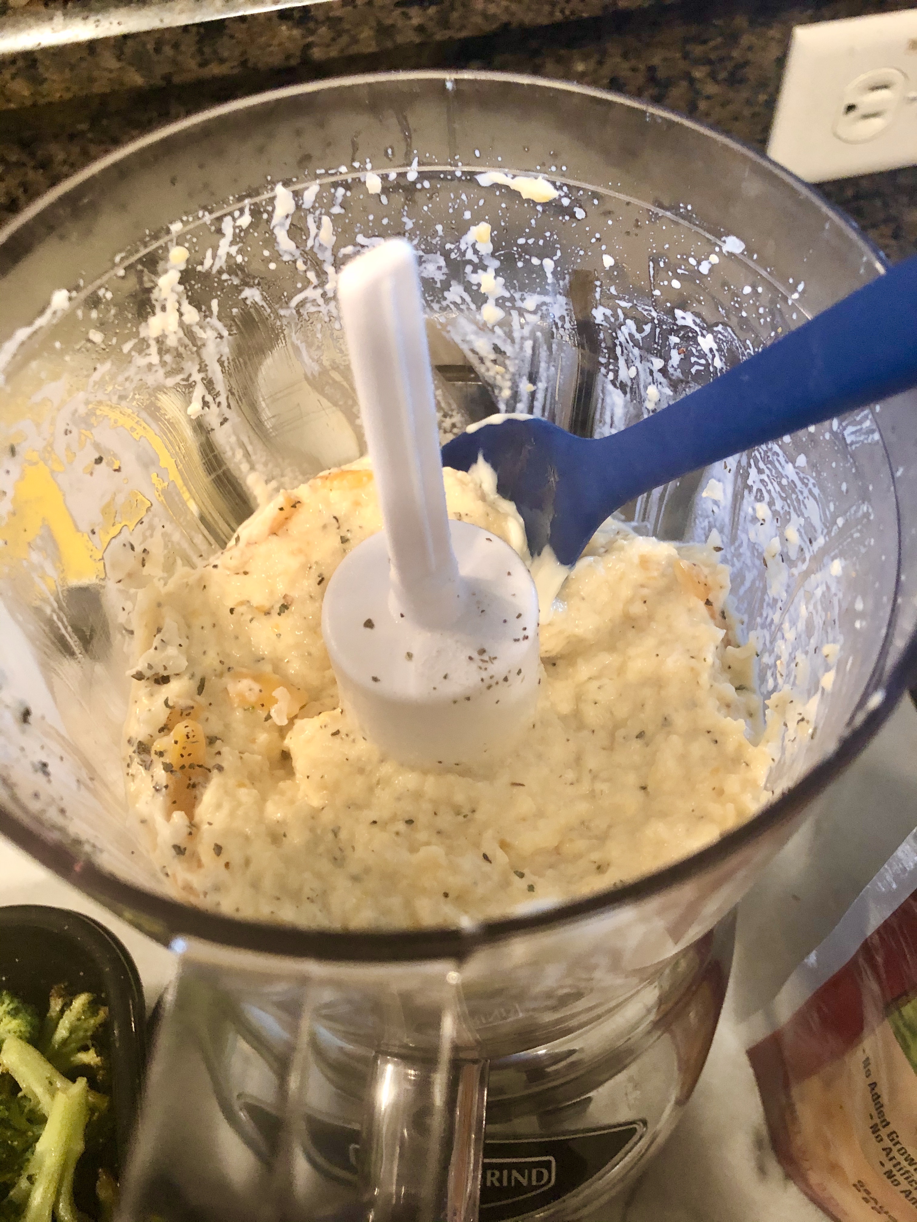 Start by throwing in some of the roasted cauliflower, then the mayo (please real mayo… not low calorie or low fat, and certainly not organic. Even organic has one of the first, if not the first ingredients, as soybean oil. Get the avocado oil based mayo OR, make your own: lemon, olive oil and egg yolks). Throw in some cheese. You will not be told by me how much of each to use; you need to taste this as you go. Everyone is different in what they like! The mayo will help with the consistency but you may want to add more or a bit of that sesame oil…
