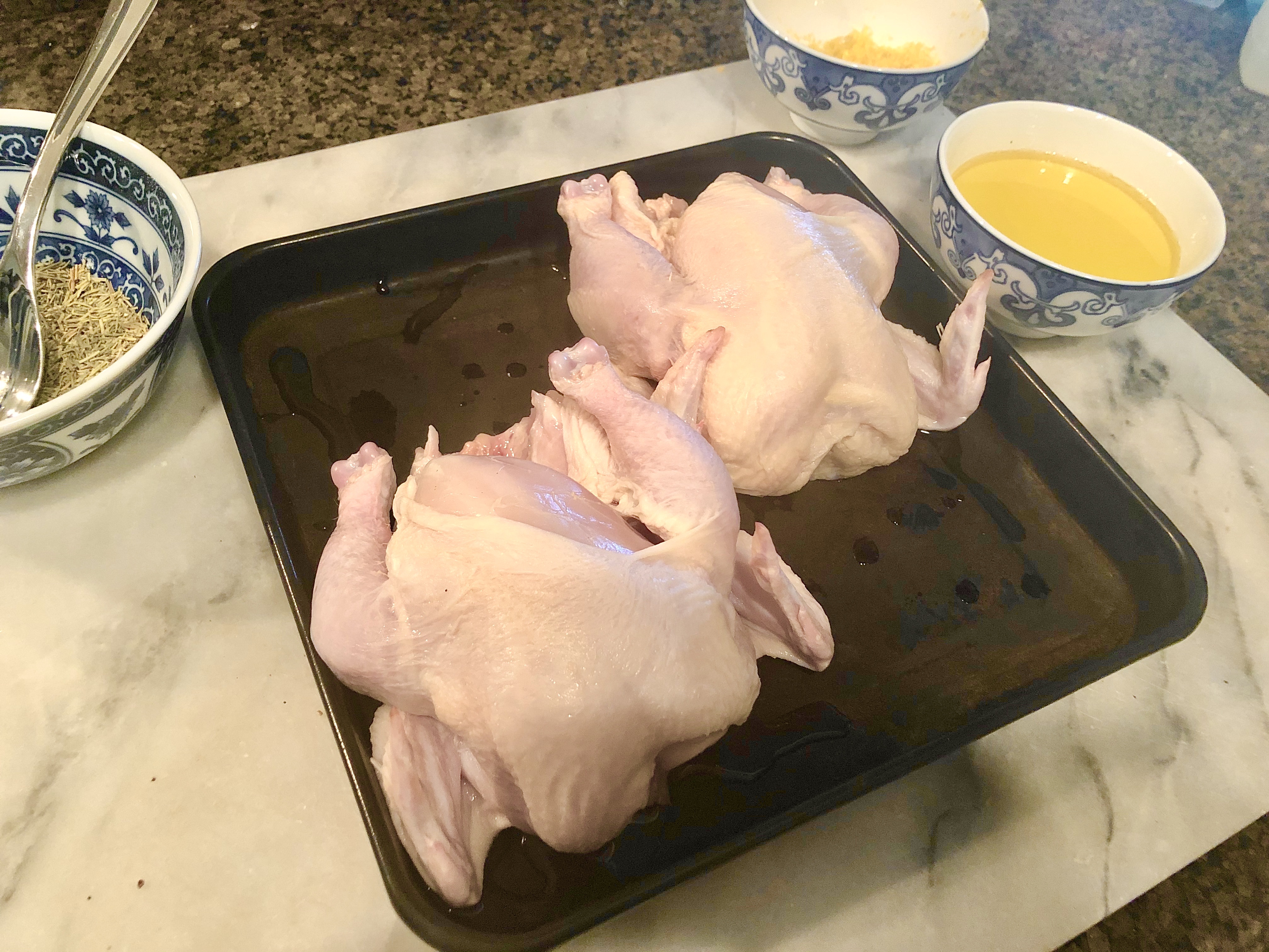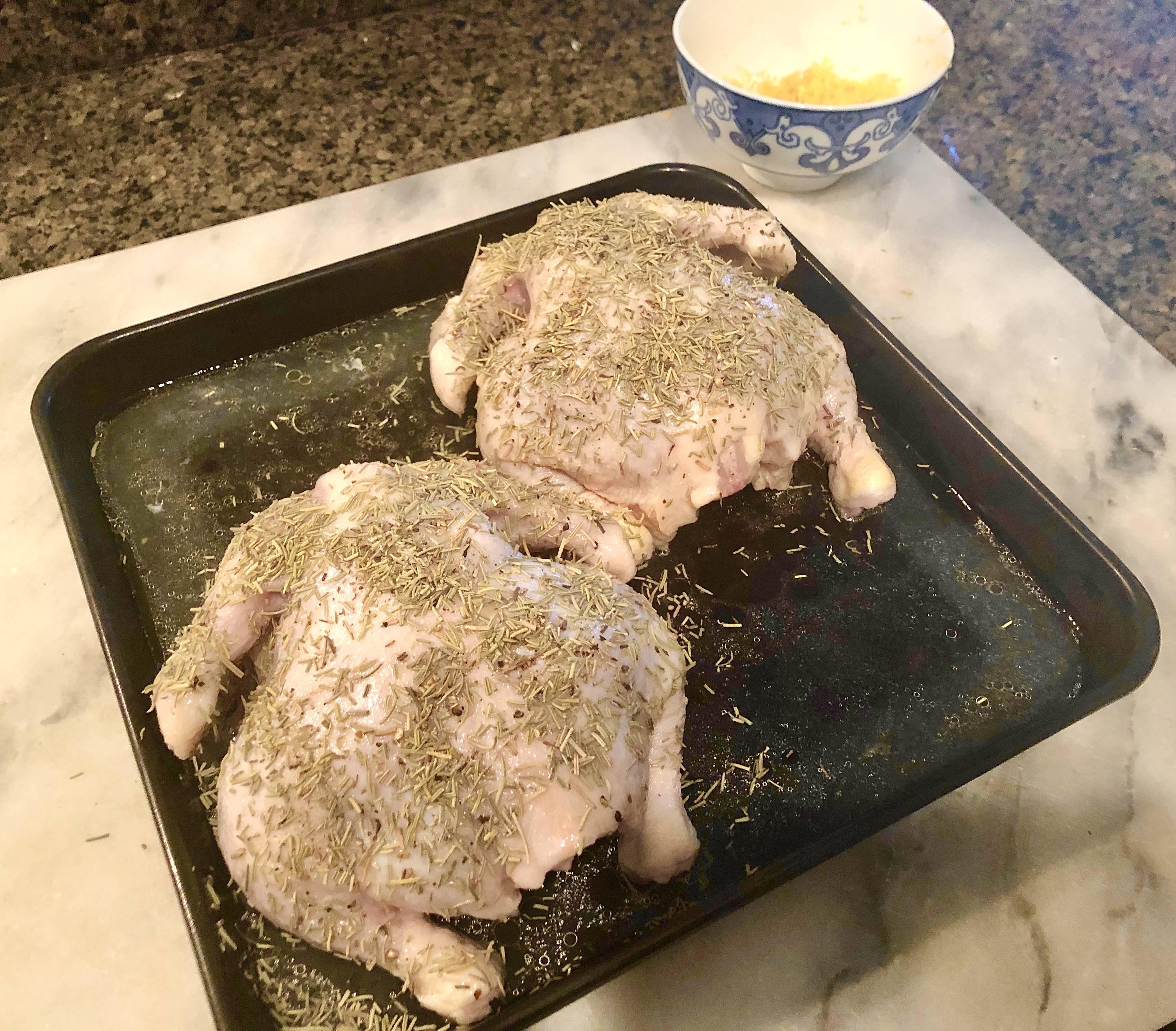 First, with a spoon or a pastry brush, put some of your lemon olive oil all over the underside of the birds. If you have on gloves, just use your hands. Then, put the dried rosemary, salt and pepper everywhere you can, making sure to leave some for the rest of the hens. Don’t forget the insides! Flip over the birds and do the same thing. The remaining lemon olive oil just pour in the pan.