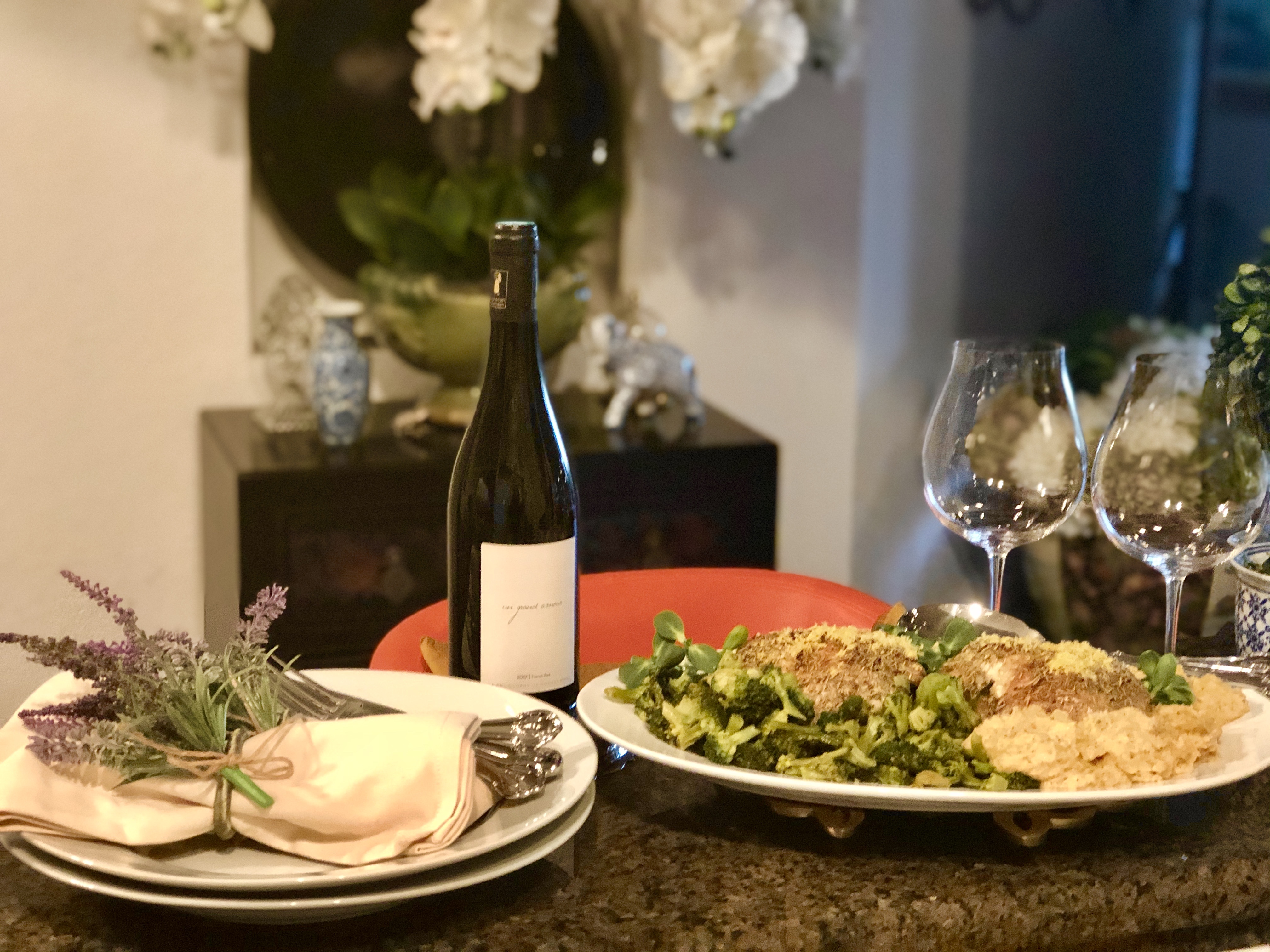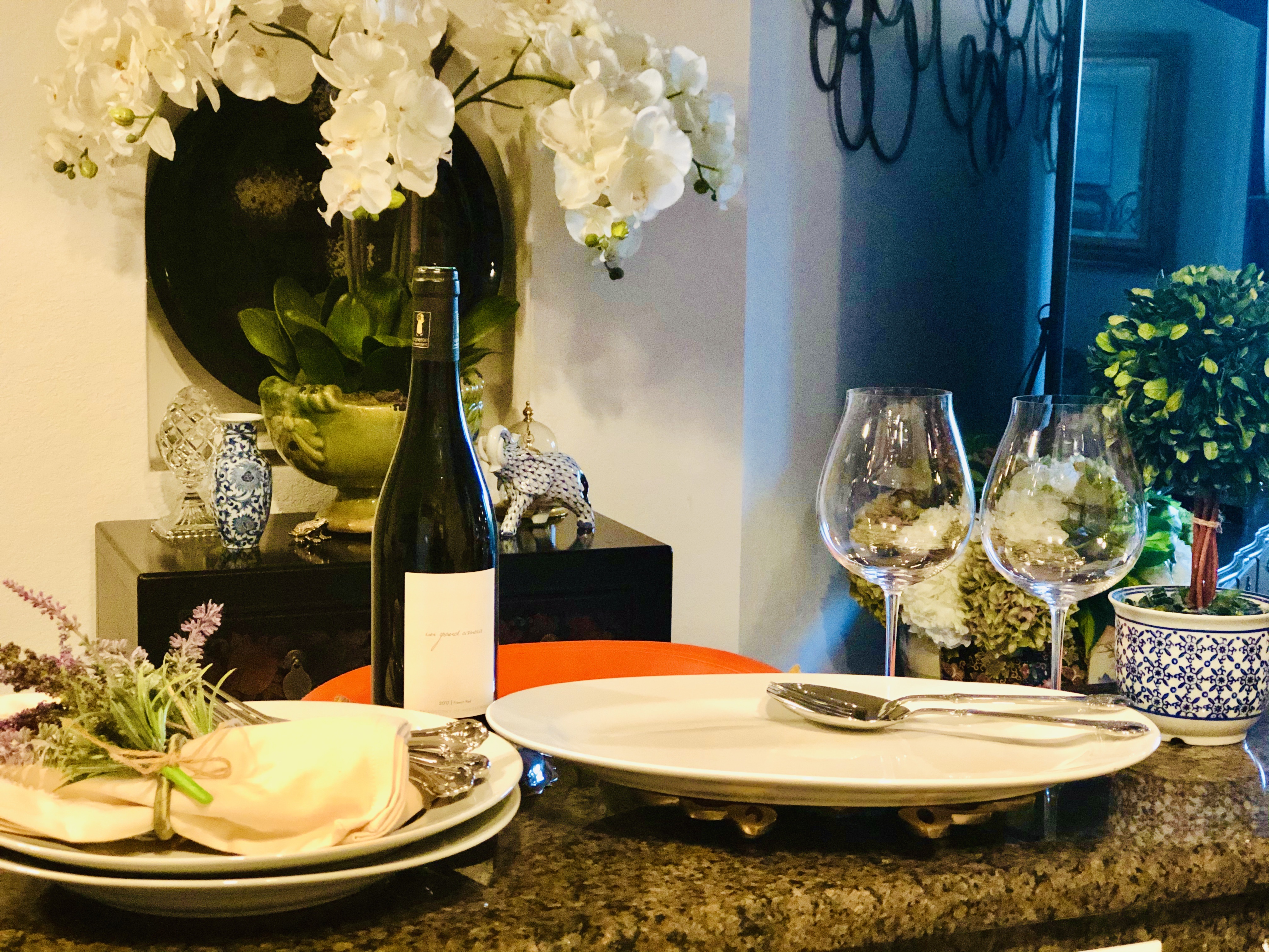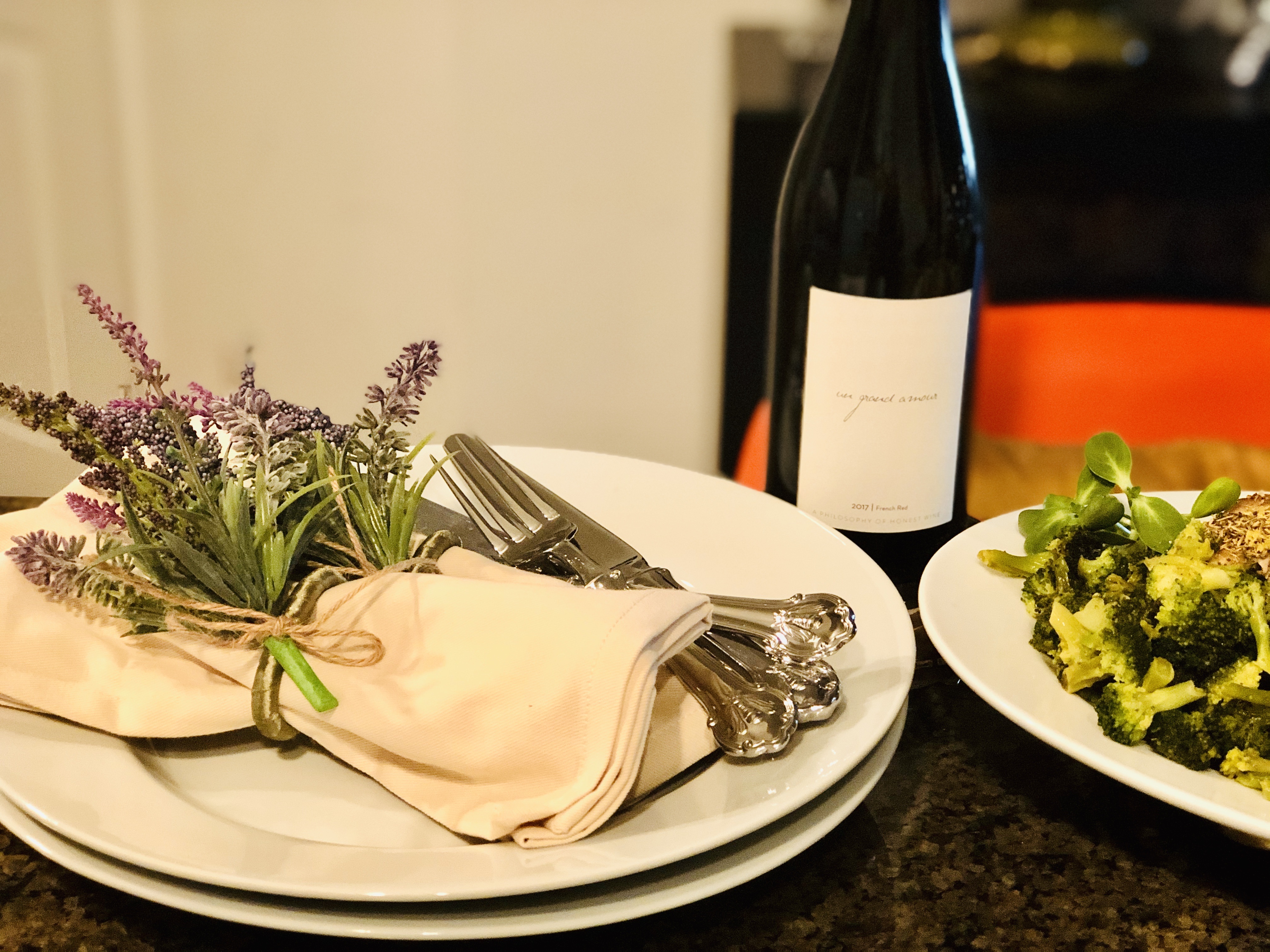 Below you will find the table-setting for this meal: The napkins and napkin rings are from Pier 1. The plates and platter are from Crate and Barrel. The trivet is from Sur la Table. The wine glasses are Riedel. The silverware and serving pieces are Napoleon Bee.