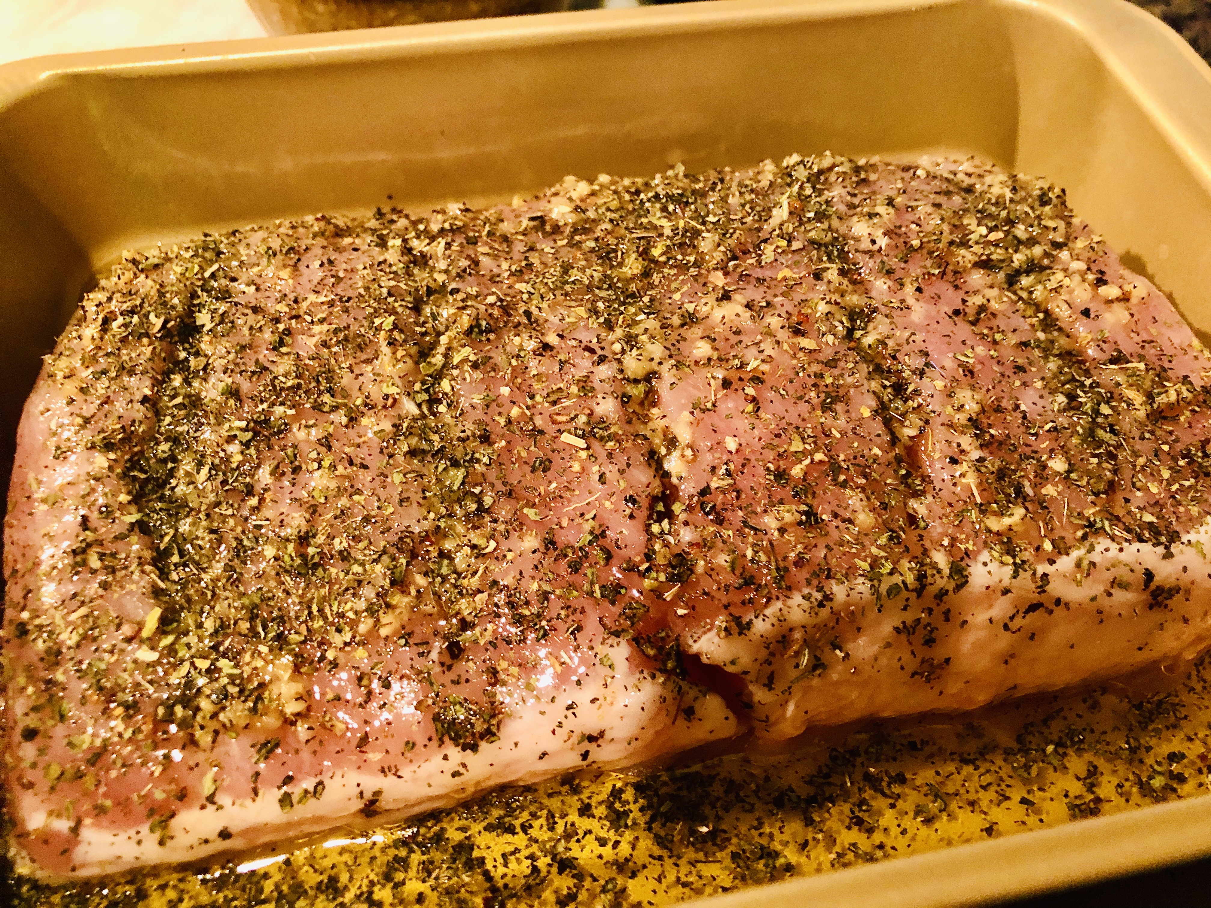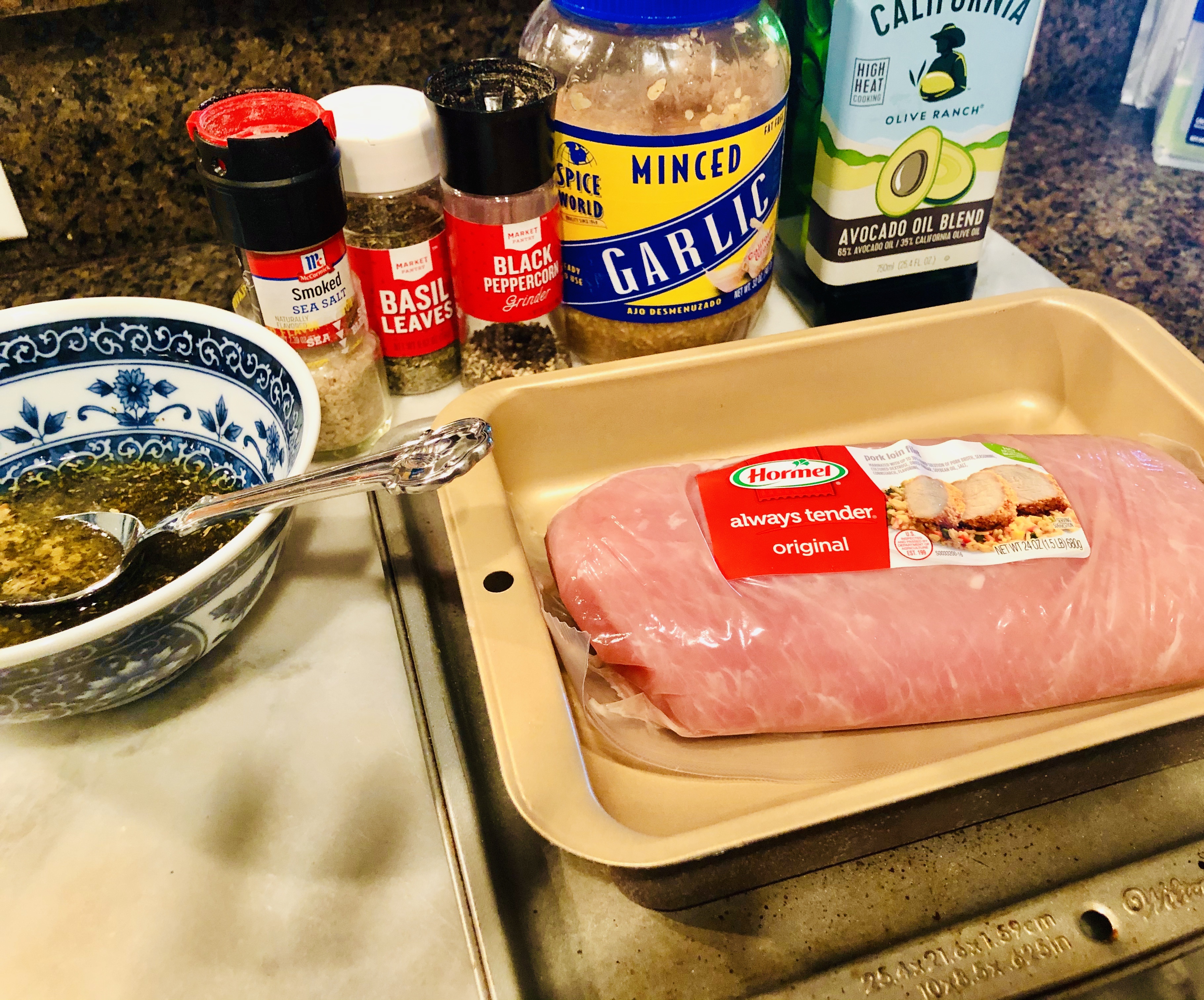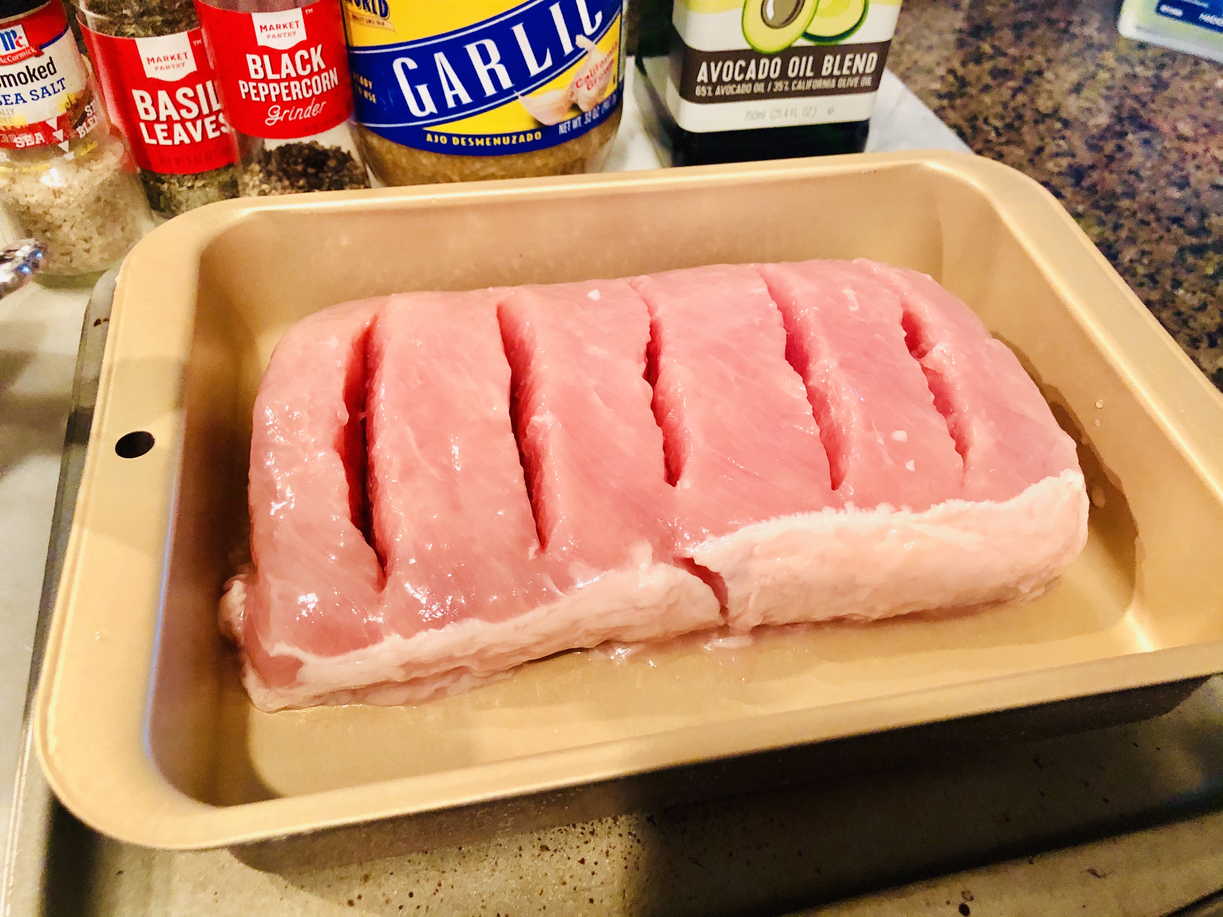 Start by prepping your sauce: mix the olive oil, minced garlic, salt, pepper and basil in a bowl. There’s no exact measurement for this – you need as much as can be spread over the pork loin as well as in the slits you’ll be creating before baking. Any extra will run off into the bottom of the pan and used as a sauce if you’d like.