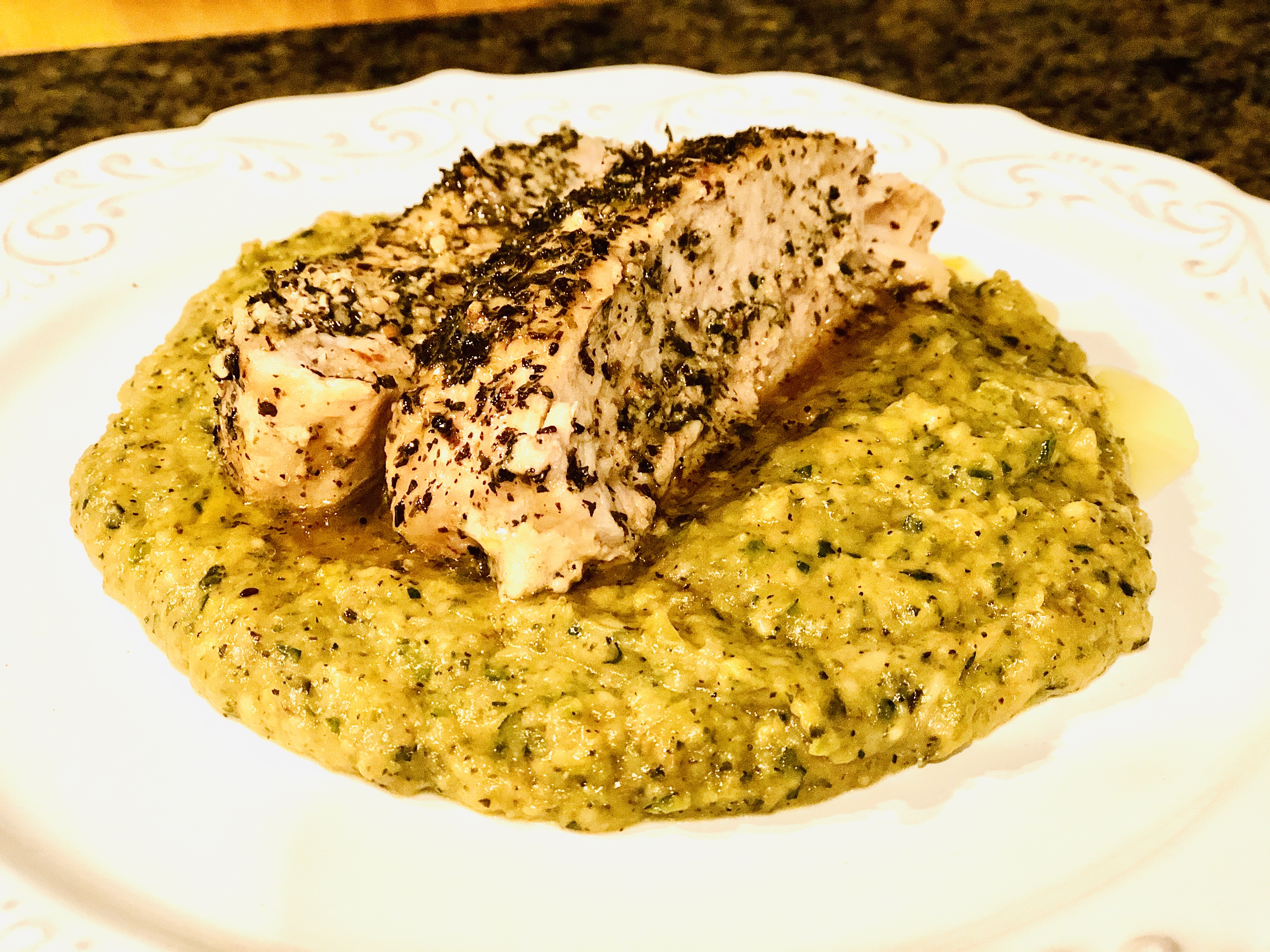 While that’s cooking, go ahead and chop down your veggies, cooking with olive oil in a pan until soft. Add them to a food processor with some cheese, salt, pepper and dried basil. Taste and see if you want to add more of something and then keep covered until the pork loin is finished cooking.