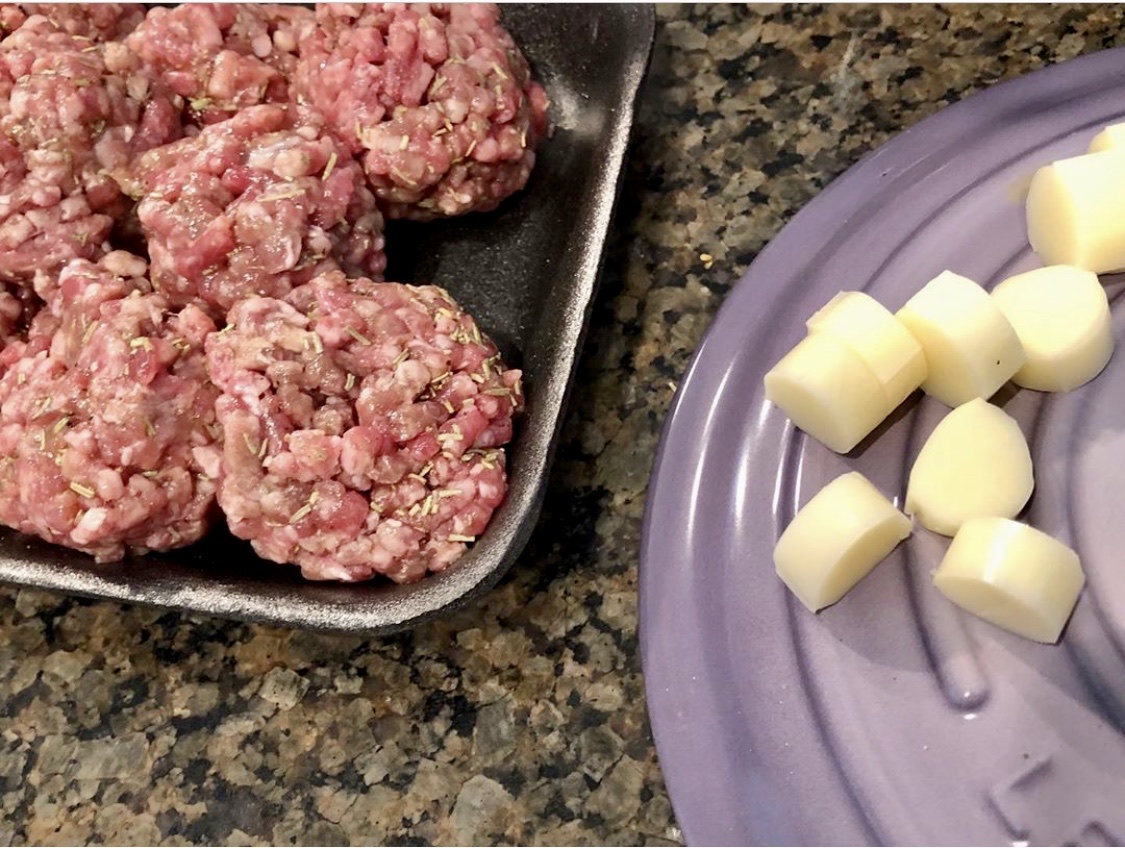 Take your ground beef and place it all into a mixing bowl with salt, pepper, your chosen seasoning and the egg. Combine. Roll into balls as close to each being the same size as you can. Depending on how many meatballs you set aside, cut your string cheese into the same amount of pieces.