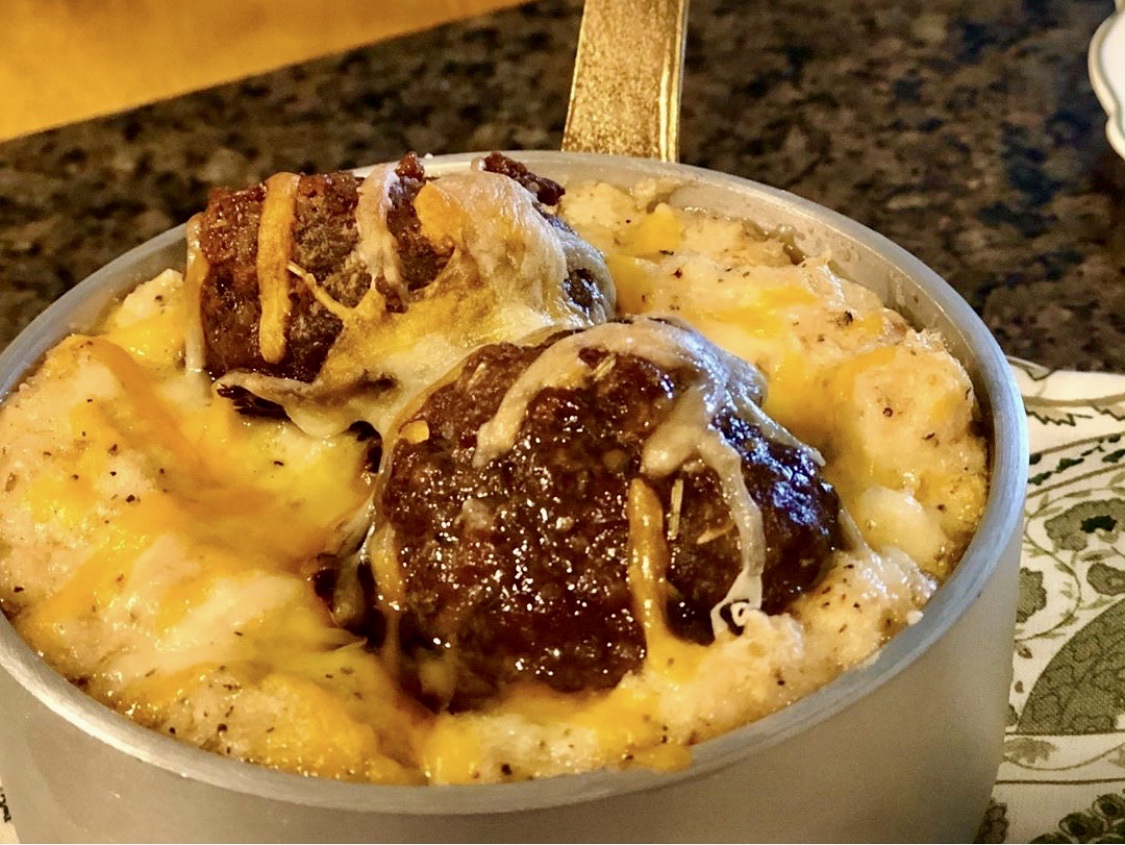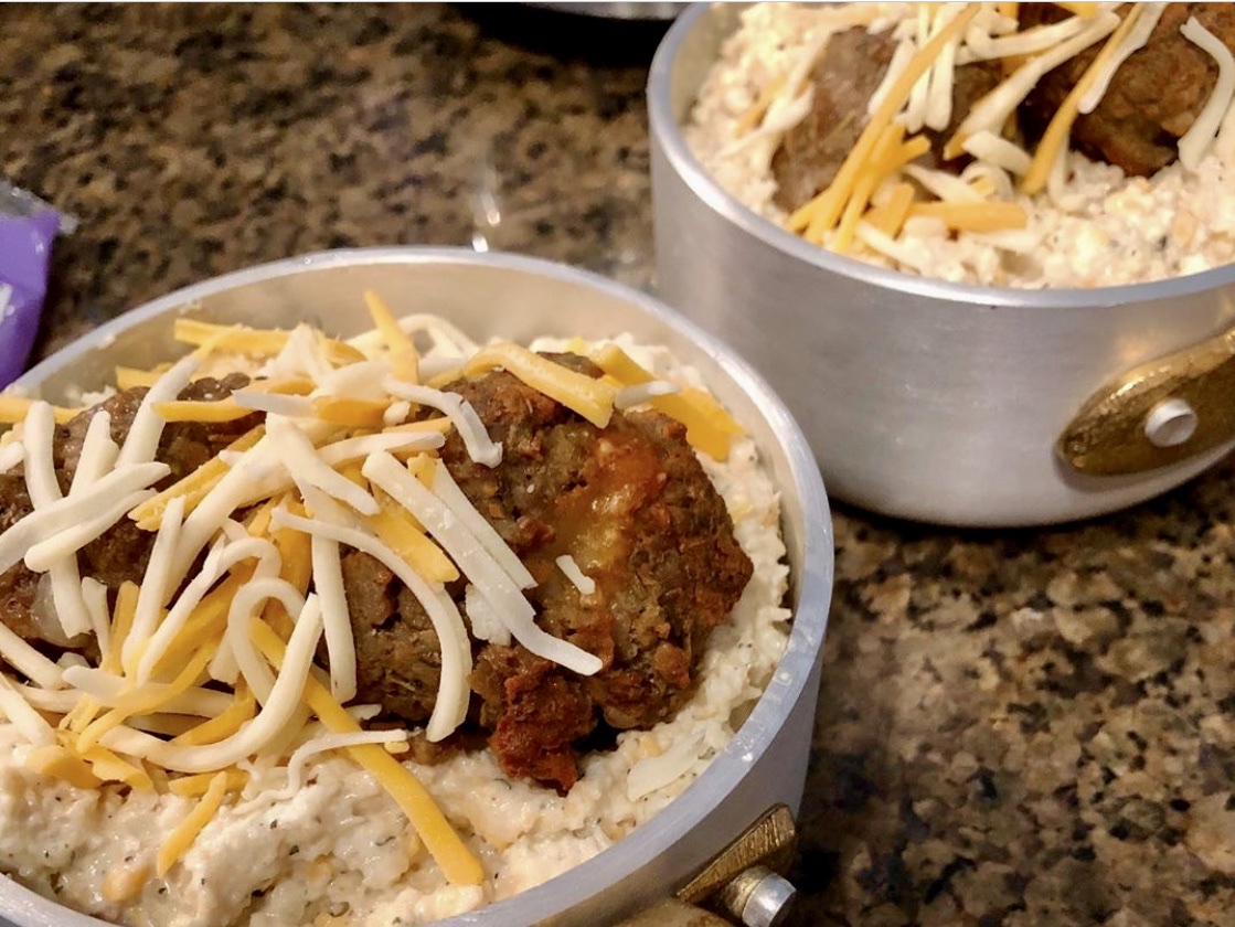 When you go to plate everything, place some of the cheesy cauliflower in a small vessel and top with some meatballs. Put cheese over everything and place in the oven to melt the cheese into the food. If it’s all being reheated, bake on 350 for about 20 mins.