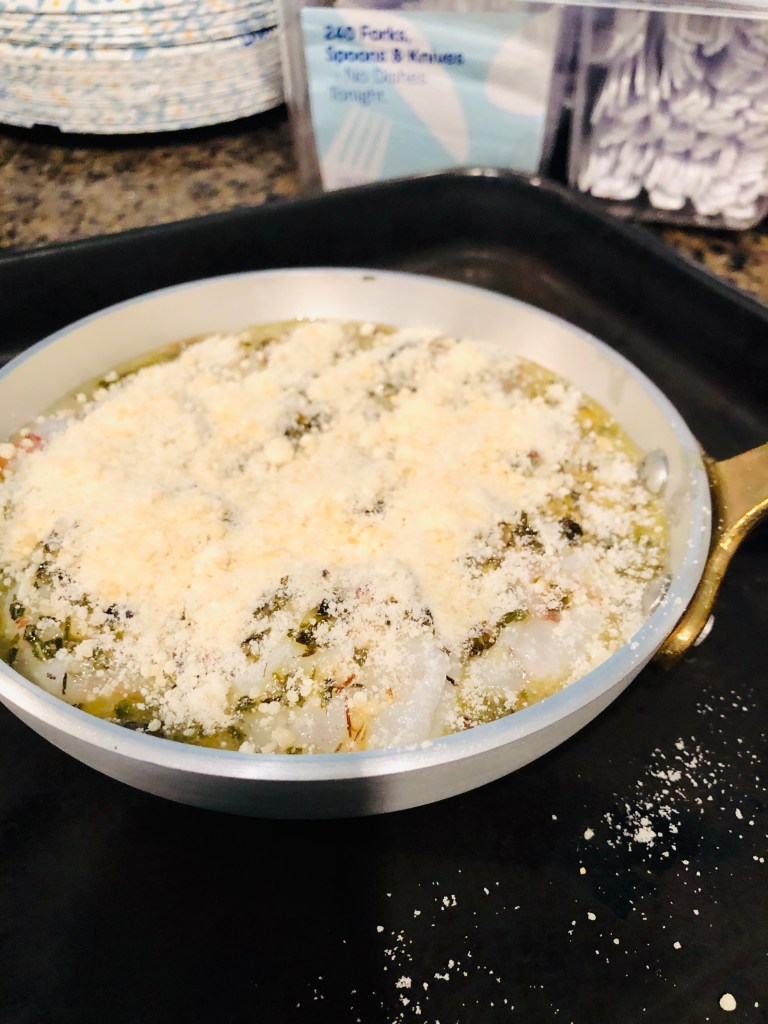 Wash your hands and preheat the oven to 350 degrees. Top the shrimp dish with the cheese of choice (again, we used grated parmesan).