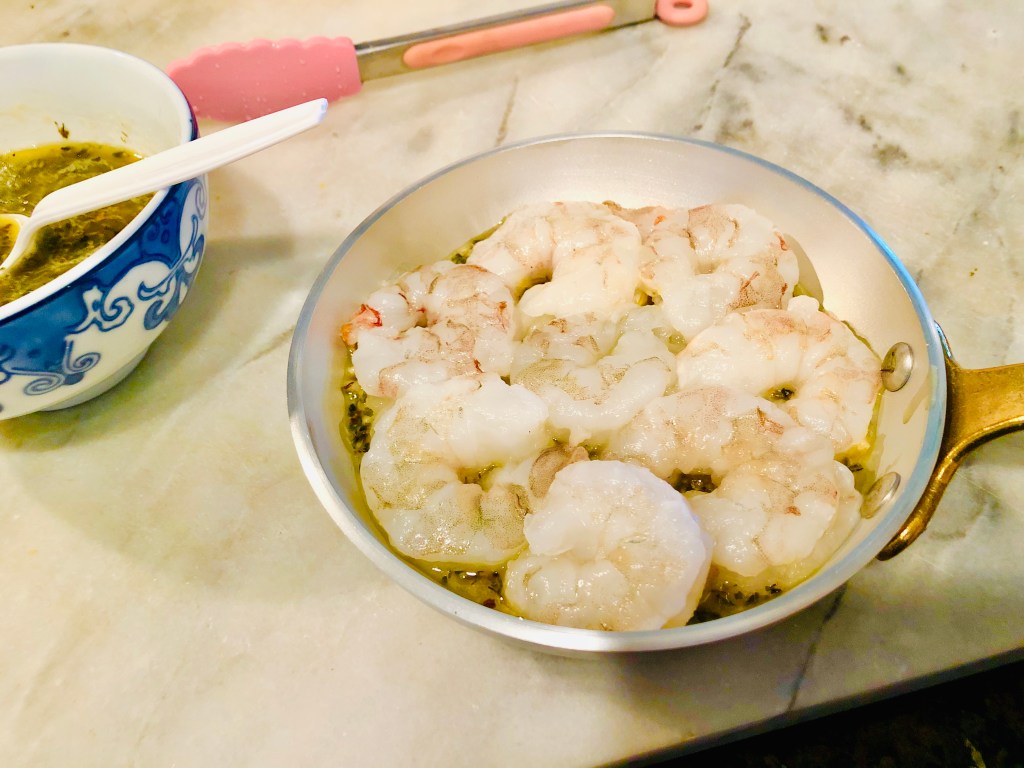 Go ahead and prep your shrimp if it’s frozen. Place them in a bowl with cold water and let soak, then drain.