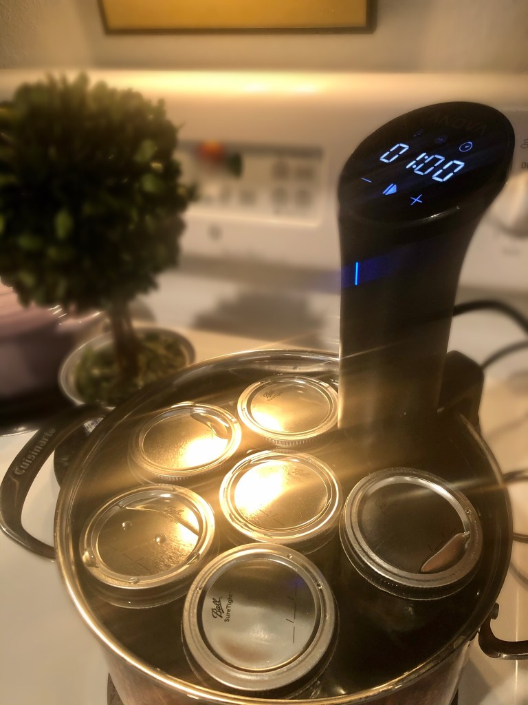 Pour the mixture into the mason jar, closing tightly enough where you know it’s closed but not too tightly. Basically, pretend you’ll be asking a five yr old to open these later. Complete this for all of your jars and get a vessel to hold water for the sous vide.