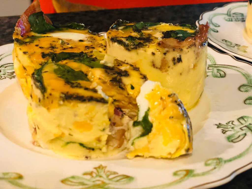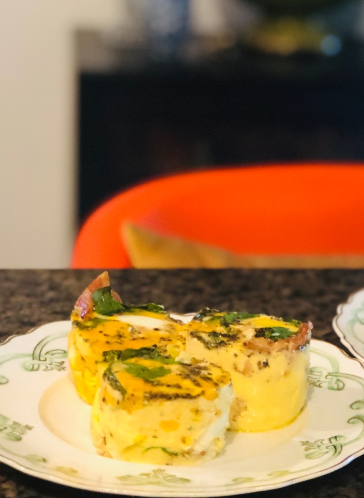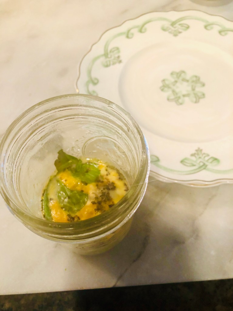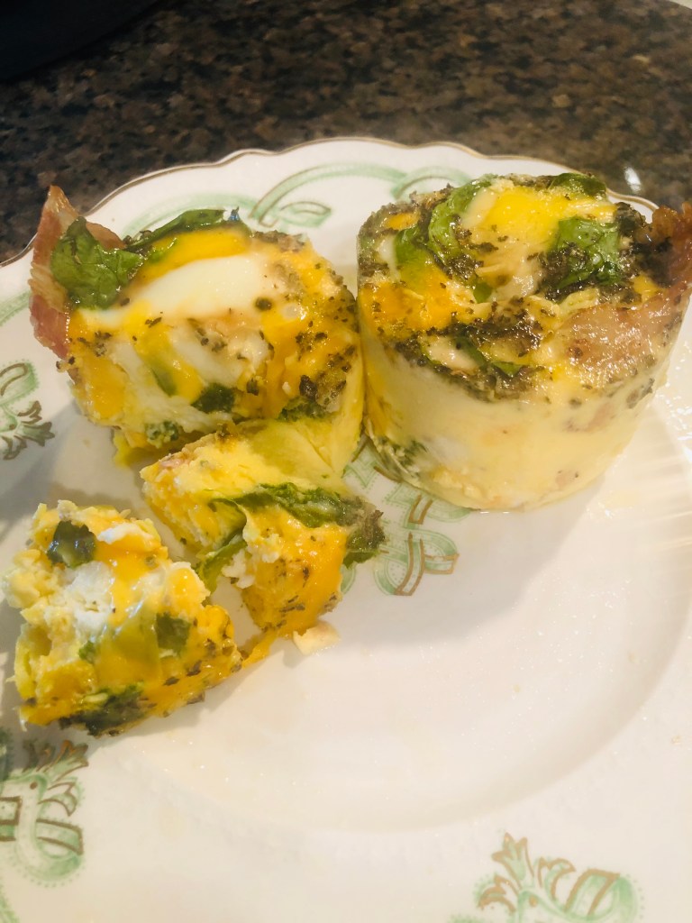 My mason jars were brand new so if yours are as well, give them a quick rinse in some soapy water. Spray the inside of your jars or use butter (or olive oil) so nothing will stick. If you choose to add bacon make sure it’s already cooked and cut each slice in half, placing the half slice in the bottom of each jar. Crack and whisk your egg in a separate bowl with a splash of half and half, adding your cheese, seasonings and rip up a few pieces of spinach (or kale, if you chose to add some greens).