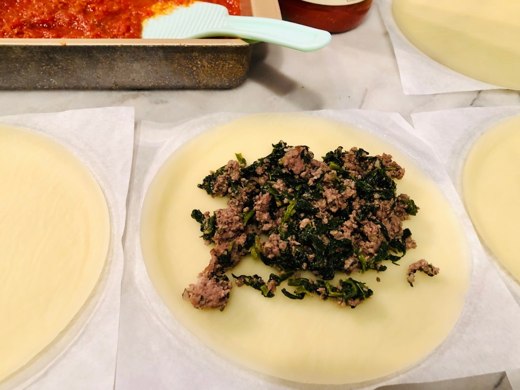 Cook your ground beef down with the spinach and season with salt, pepper and herbs de provence.