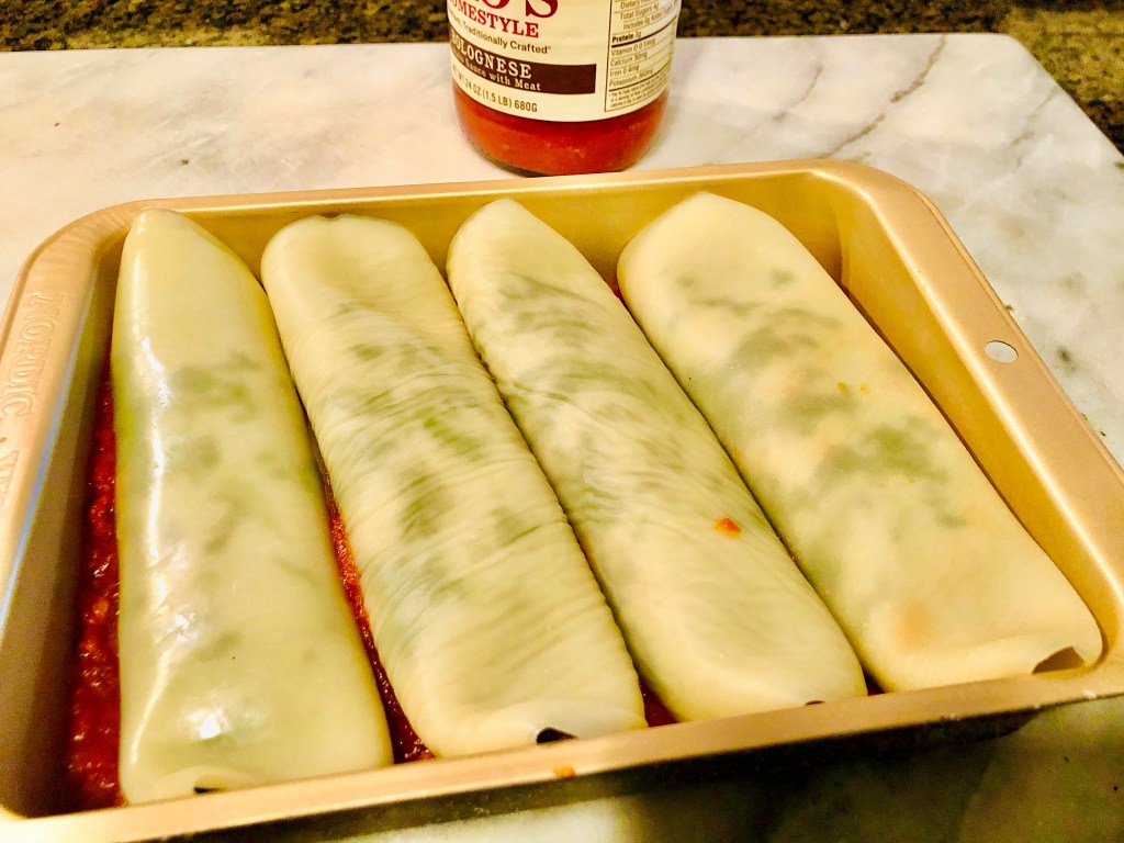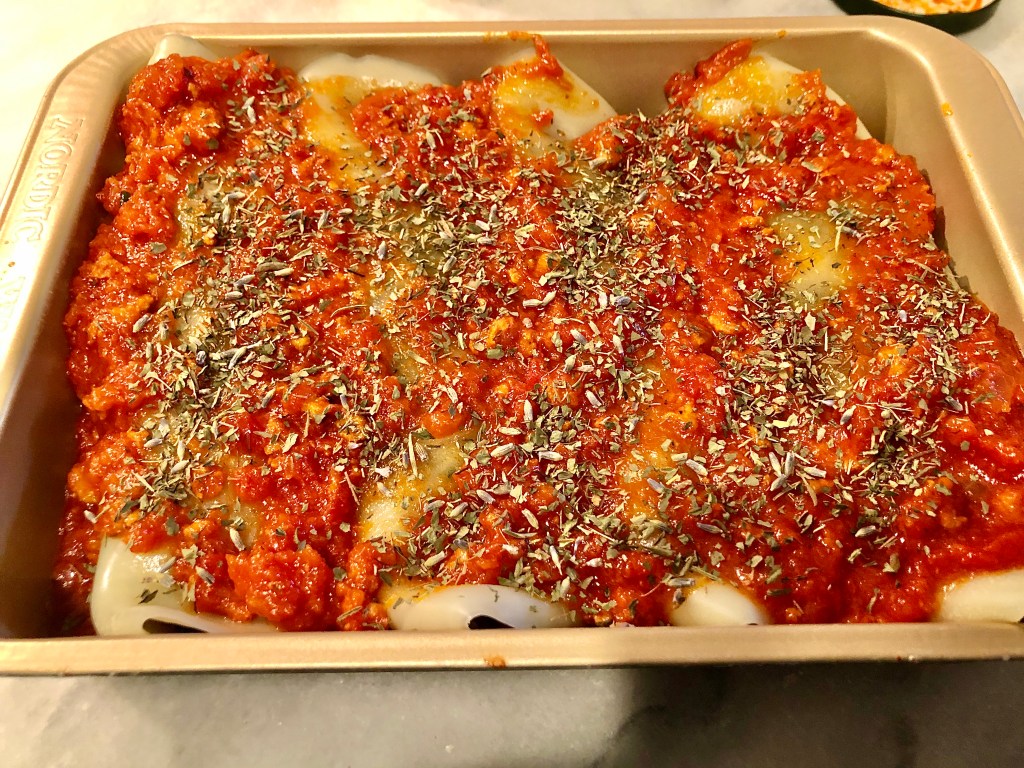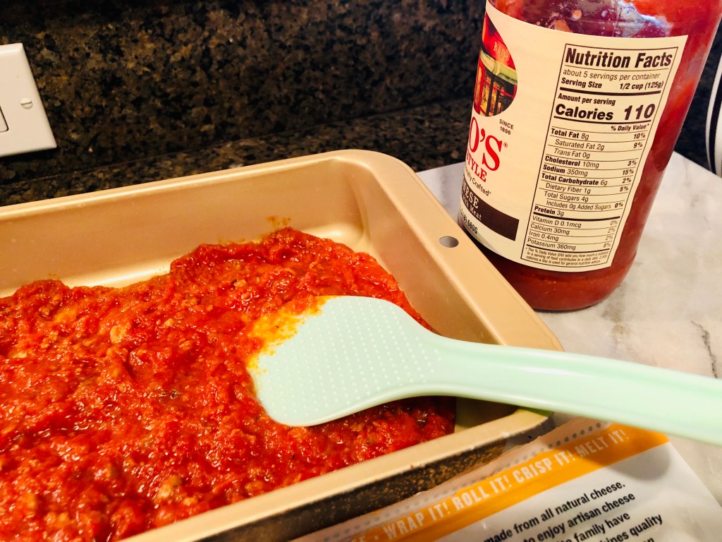 Spread some of the sauce on the bottom of the dish like you would for a lasagna. See nutritional info on the sauce below: