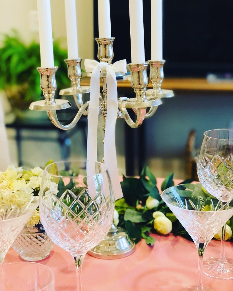 The martini glasses and pitcher are from Waterford. The domes and flower centerpiece are from afloral. The napkins and tablecloth are from Bed Bath and Beyond. The dishes are from Pier 1.