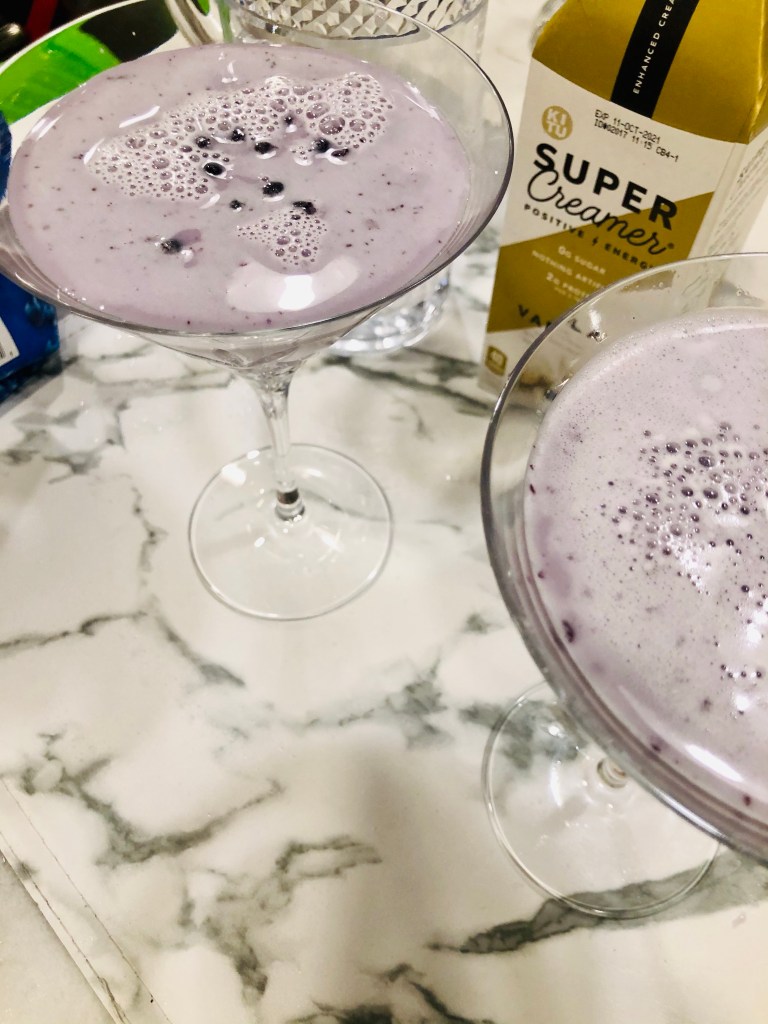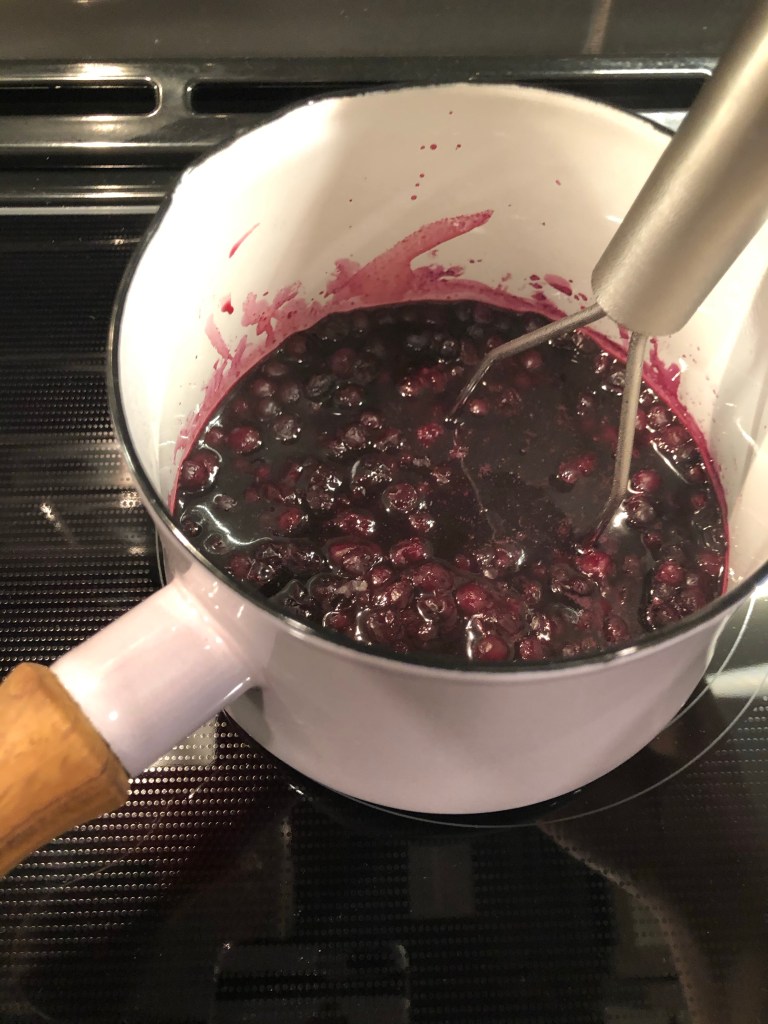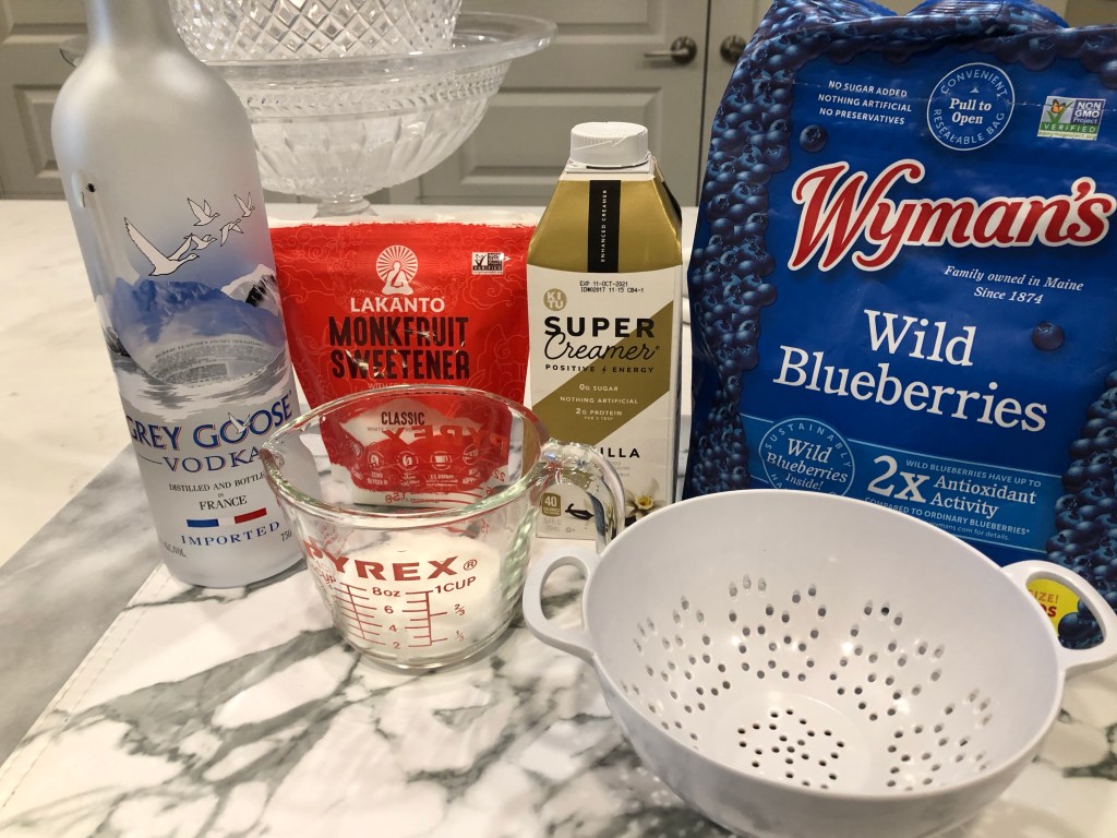 We always have frozen wild blueberries in our freezer for smoothies or top with our keto French toast, and to make sauces for salads or in this case a “syrup” for our martini, I always start by cooking them down.